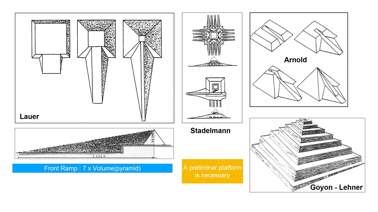 Illustration des différentes théories « rampistes » (ouvrages annexes qu’il faudra ensuite démolir !). La plus simpliste est la théorie de la rampe « frontale » de J-Ph. LAUER. Remise dans son contexte topographique, elle nécessite la création d’une plateforme d’assiette horizontale (sur un terrain en pente : où mettre les déblais ?) puis la réalisation d’une rampe en terre ou en pierre qui doit franchir, et la hauteur de la pyramide (147 m), et le dénivelé entre la plaine alluviale et la plateforme (41 m) soit au total 188 m. Cette rampe à 10% de pente mesurera 1 880 m et à 5% 3 760 m de longueur et fera, selon l’angle du talus, jusqu’à 7 fois le volume de la pyramide elle-même ! Il faudra ensuite la démolir... ce qui double le travail !! Cette « théorie », comme les autres théories « rampistes », ne peut être admise par un Constructeur quelque peu expérimenté.