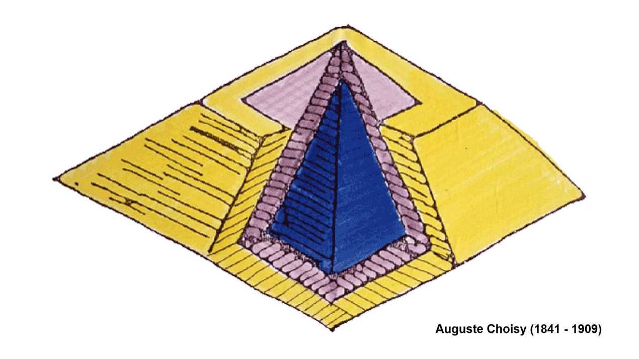 Ce schéma fourni par l’Ingénieur-Architecte Polytechnicien (X) français, historien de l’Architecture, exprime la même intuition que moi-même, à savoir un grossissement volumique « en pelures d’oignon » (qu’il n’a pas développée plus avant).