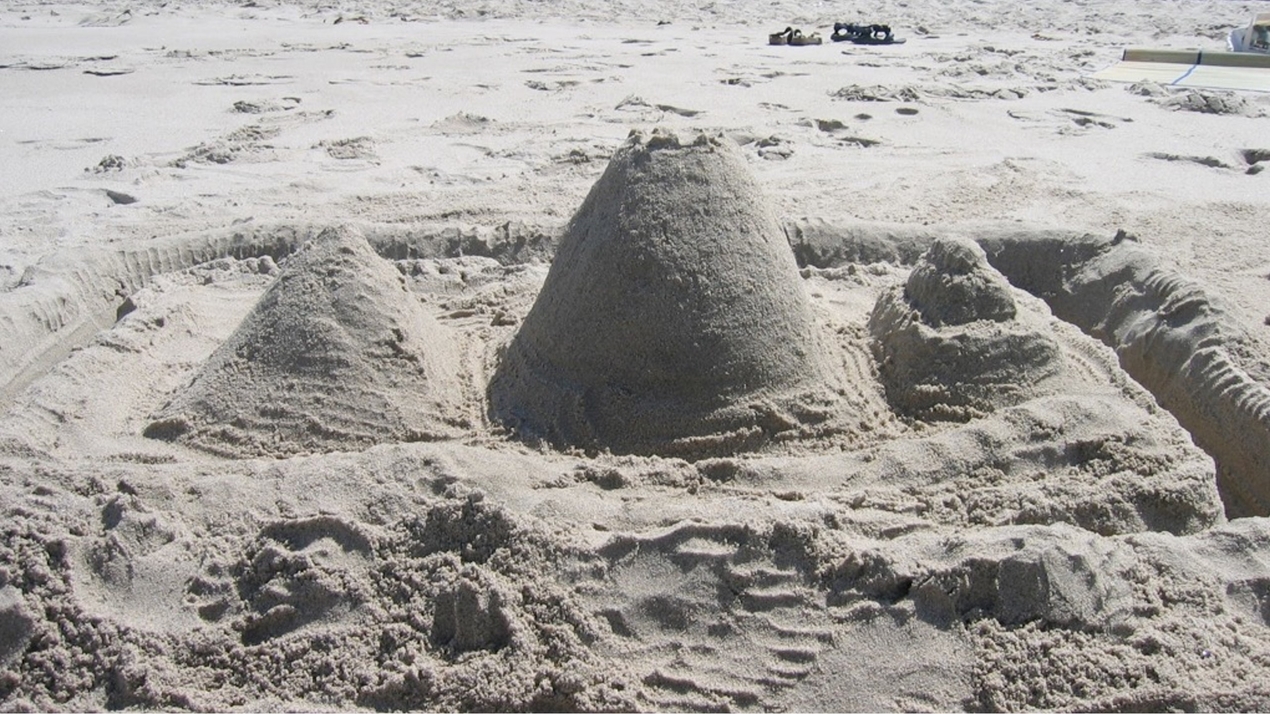 en bas : l’énoncé du « théorème du château de sable » : un enfant de 3 ans assis sur la plage, de ses 2 mains ramasse du sable pour en faire son tas. Il trouvera seul le moyen de le faire grossir (ou s’accroître) : « l’accroissement volumique » illustré par la photographie suivante.