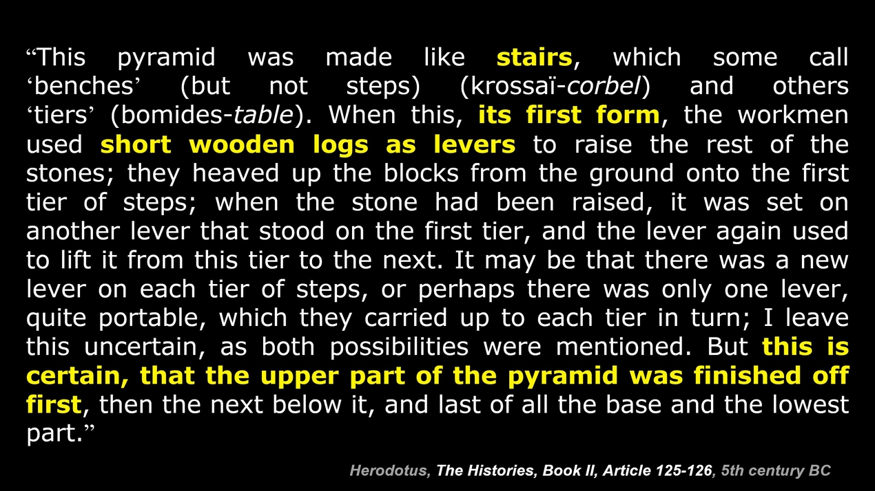 Cette version anglaise m’a semblé manquer de précision par rapport à la version française : elle peut prêter à confusion avec les « pyramides à degrés (step-pyramids) » ; plutôt que « step (degrés) » utilisez « benches » (pour gradins, bancs) », « on la construisit d’abord sous cette forme, puis... » laisse à penser que cette forme peut être construite d’une autre façon que par le procédé dicté par l’utilisation de la « machine » dont Hérodote va nous décrire alors le mode opératoire.