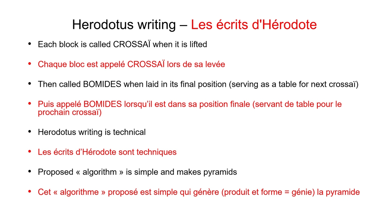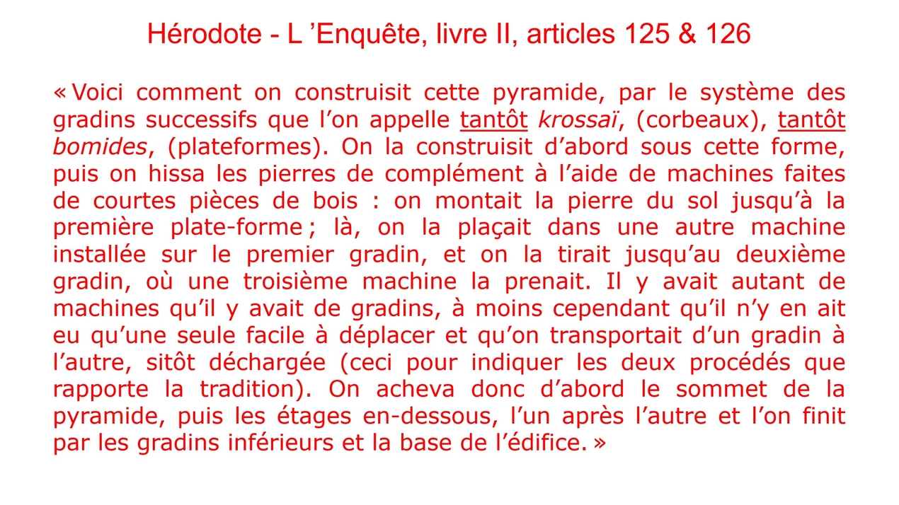 Cette version française du texte d’Hérodote (traduction d’Andrée BARGUET – FOLIO classique – France - 1985 – ISBN : 978-2-07-037651-3) apporte d'intéressantes précisions par l'emploi de termes comme « gradins » quand d’autres traductions emploient celui de « degrés », ce qui fait confusion avec les « degrés » des Pyramides à degrés (degrés de 10 m de hauteur). Confusion faite par de nombreux pyramidologues après – telle la théorie d’ E. Guerrier – qui pensent que l’on construisit l’ouvrage d’abord en pyramide à degrés et que l’on combla ensuite ces degrés pour la rendre « lisse ».