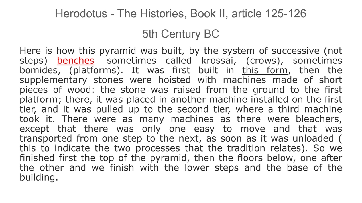 This English version seemed to me to be inaccurate compared to the French version: it can be confusing with “step-pyramids”; rather than “step (degrees)” use “benches”, “It was first constructed in this form, then ...” suggests that this form can be constructed in another way than by the process dictated by the use of the “machine” which Herodotus will describe to us then the mode procedure. Many readers have understood that the pyramid was built by starting from the top or that the coating but landed from the top, but this is the finish of the coating (which will be “cut” from the top.)
