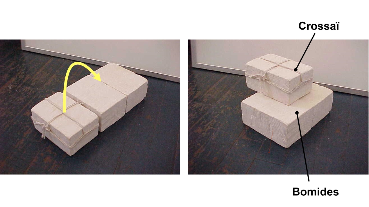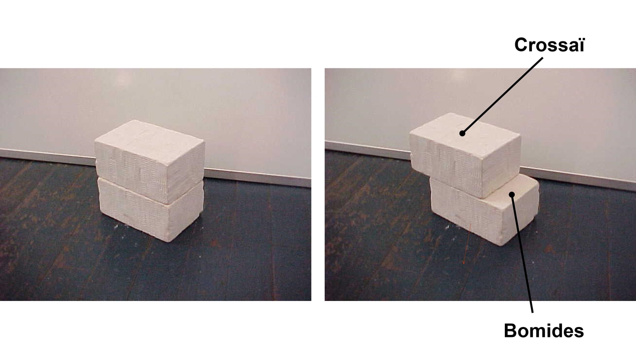 Afin de préciser ces deux termes (apax) du domaine de la construction, deux blocs identiques exactement superposés ne disent rien. Si l’on décale celui du haut, il forme devant « l’entablement » servant d’appui (bomides) et derrière « l’encorbellement » (crossaï).