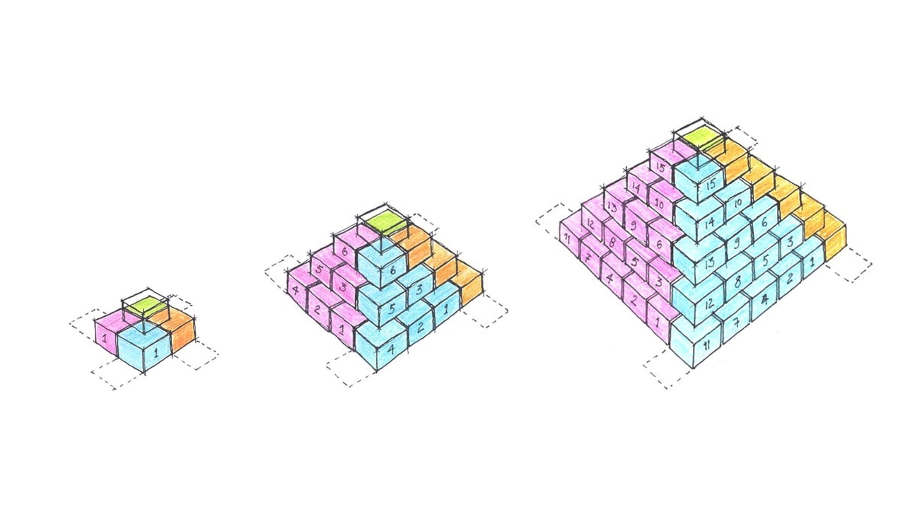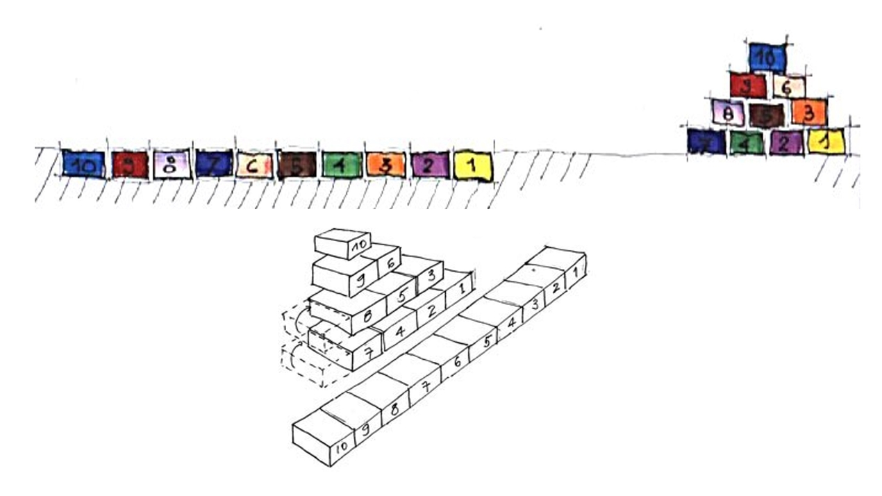 Le croquis du haut : à gauche, représente des blocs (numérotés) dans une carrière horizontale, à droite indique par sa numérotation l’ordre d’empilage (idem les Nombres triangulaires).