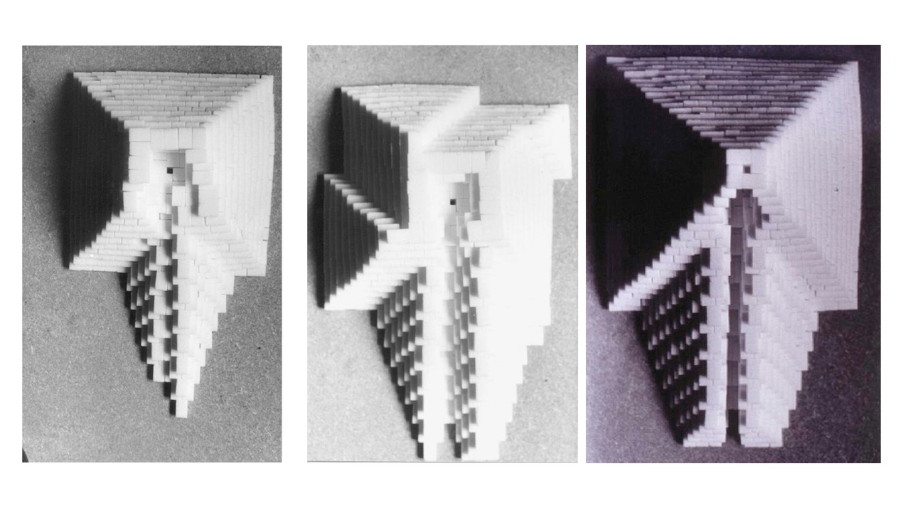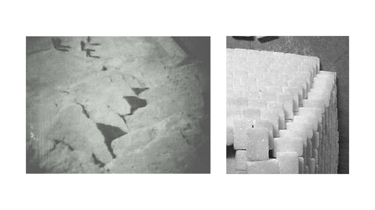 La modélisation « manuelle » du SYSTÈME CONSTRUCTIF DES PYRAMIDES date de 1996, ici par l’empilage de morceaux de sucre (Beghin Say n° 4). Elle permet de faire s’accroître la pyramide sur elle-même par cônes-enveloppes successifs emboités les uns sur les autres ; de réserver une chambre et, par anticipation sur l’une quelconque des faces, de réaliser une rampe d’accès. Chambre et rampe se refermeront par encorbellement et seront englobées dans la pyramide par la poursuite de la construction sur les 4 faces.