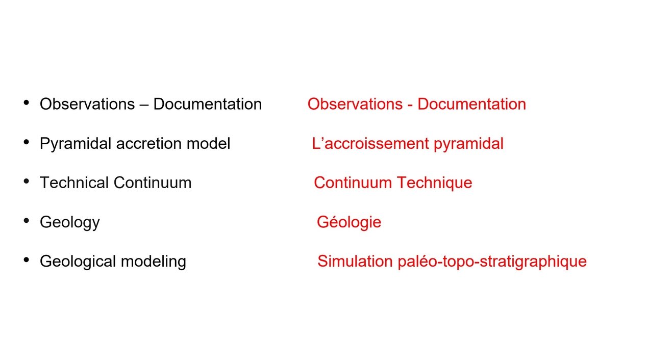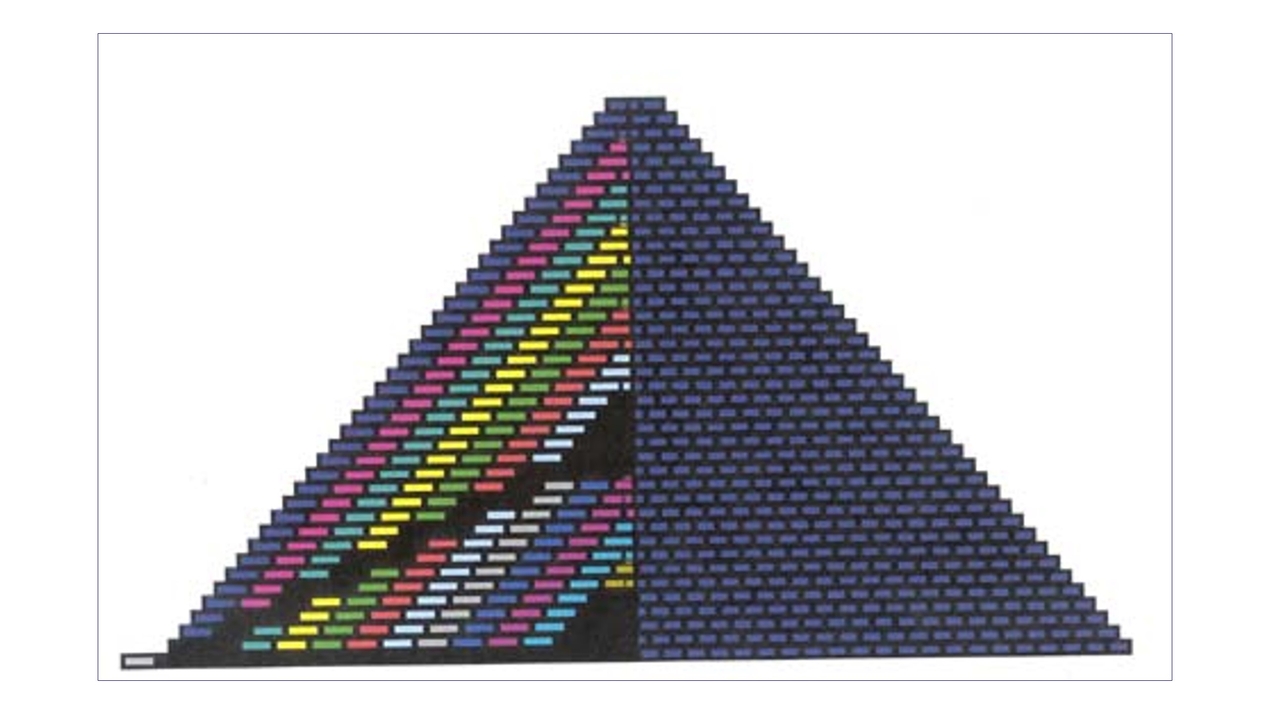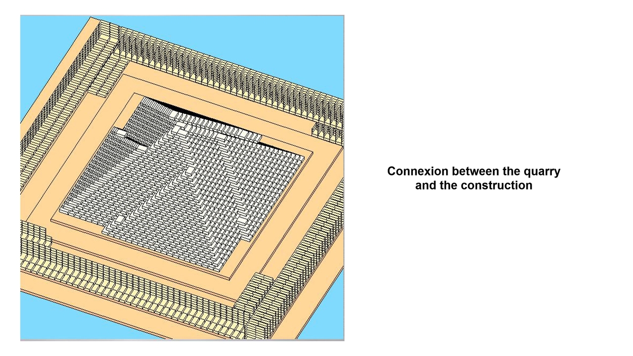 Simulation infographique, proposée par l’Auteur (réalisée par des étudiants de l’Ecole des Mines de Nancy – Prof. O. Deck – 2005) de la correspondance entre l’extraction des blocs en carrière horizontale au pourtour même, par phases successives, avec la construction de la Pyramide, par cônes-enveloppes superposés, selon la méthode dite « d’accroissement pyramidal » (P. Crozat – 1997).