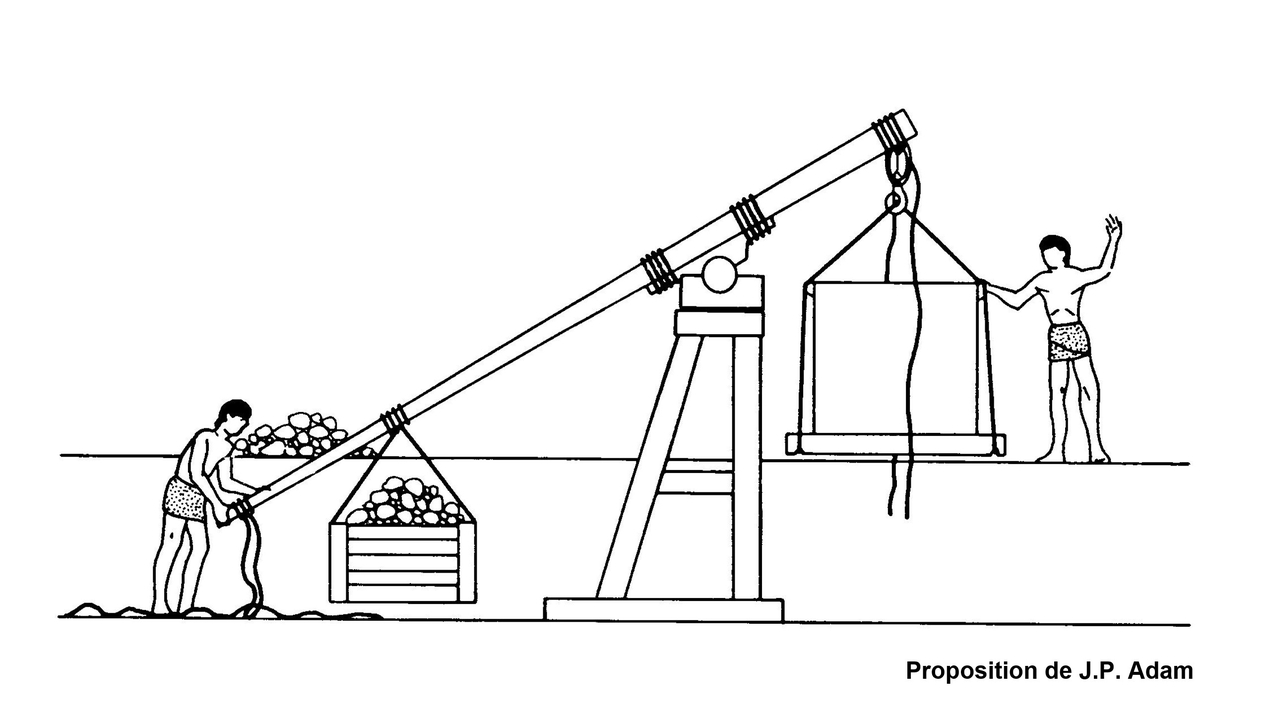 La machine proposée par Jean-Pierre ADAM, architecte de formation versé à l’Histoire de l’architecture dans « L’archéologie devant l’imposture » (Ed. Robert Laffont, 1975), semble bien trop volumineuse et sophistiquée pour lever un bloc de 2,5 t et surtout fastidieuse à servir pour le chargement du caisson contre-poids qu’il faudra charger et décharger à chaque mouvement. Alors que le poids de quelques « gros » de l’équipe d’appareilleurs est bien plus simple, utile et mobile. Depuis cette époque, cet auteur en est revenu et de « machiniste » s’est converti en « rampiste » ; pourquoi donc ?