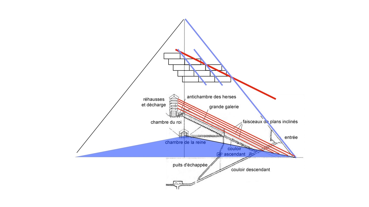 Coupe médiane NS de la pyramide de Khéops, sur ses dispositifs intérieurs (du bas vers le haut: la chambre souterraine inachevée, et son couloir descendant, le couloir ascendant, le couloir horizontal et la chambre de la Reine, la Grande Galerie, l’antichambre des herses et la chambre du Roi, surmontée des 5 chambres de rehausse et de l’arc de décharge (dispositifs connus à cette date) montrant (en rouge) le faisceau de plans inclinés (rampes) construit par anticipation sur la face Nord, servant à l’acheminement des monolithes de granite des « rehausses » (faussement appelées « arcs de décharge ») et de l’arc de décharge proprement dit.