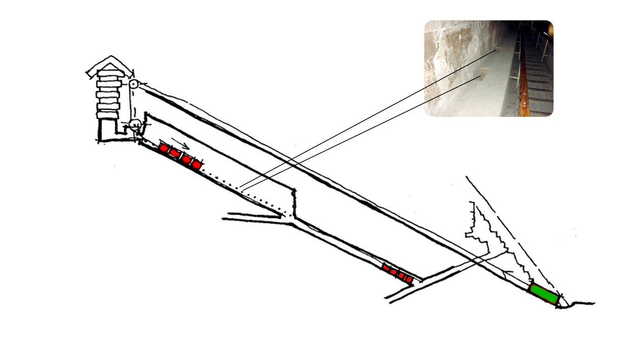 Alors vient à l’esprit que la GG – selon le schéma d’illustration ci-dessus –, composée d’une glissière centrale et de 2 banquettes latérales munies de mortaises régulièrement disposées formant un couloir avec crémaillère, aurait un rôle « utilitaire » et constituerait un « extraordinaire ascenseur oblique » avec comme contrepoids les futurs blocs-tampons qui ensuite boucheront le couloir ascendant (blocs-tampons que le Calife Al Mammoun a contournés et détruits en partie). Ascenseur qui permettra de mettre en place (en rappel) tous les monolithes de granite (rehausses en flexion) et de calcaire (arc de décharge en compression). L’antichambre des herses (facilement contournée) n’a pas de rôle de fermeture mais de réarmement (remonter les blocs contrepoids) de l’ascenseur, ces 3 herses étant montées suspendues sous trois rouleaux de bois (afin d'être manœuvrées souvent) et leur poids cumulé équivalant à un bloc contrepoids. (P. Crozat – 1997)