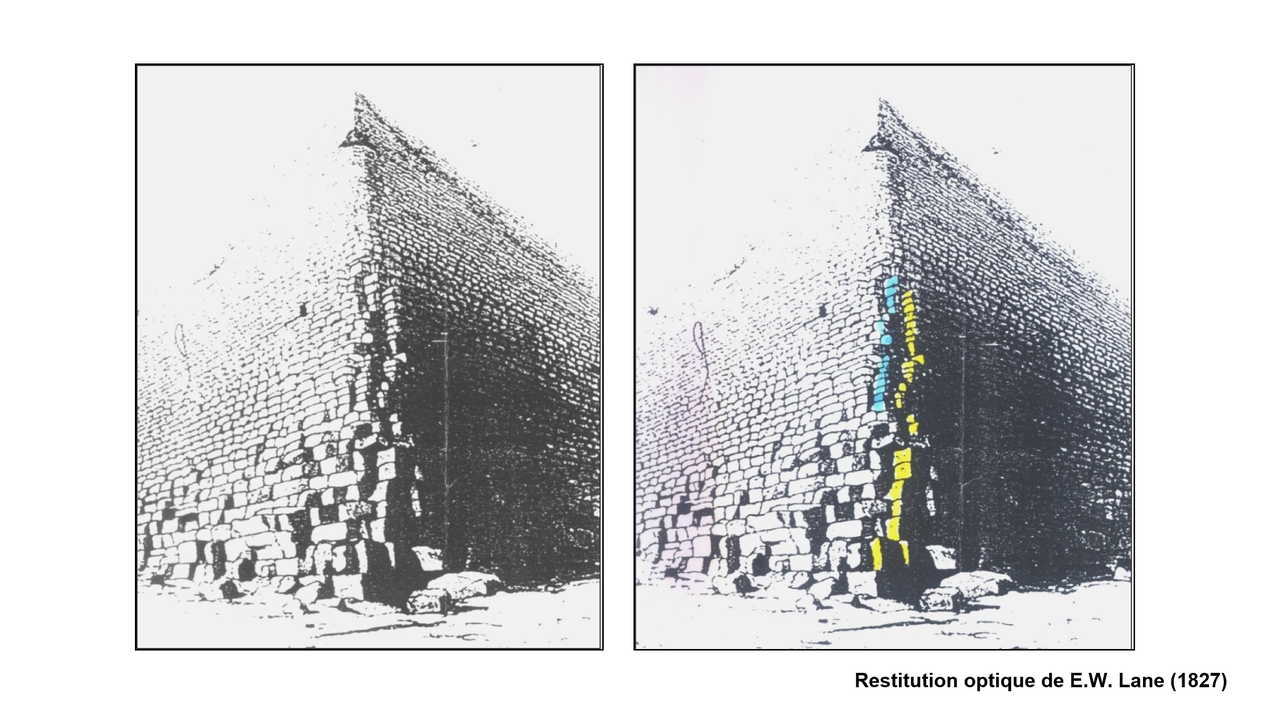 Ce dessin (camera lucida) de F. W. LANE de l’angle NE de Khéops (on reconnaît le trou en haut sur l’angle) semble bien vouloir montrer les 2 derniers cônes enveloppes dégradés, la pierre d’angle étant facile à faire choir.
