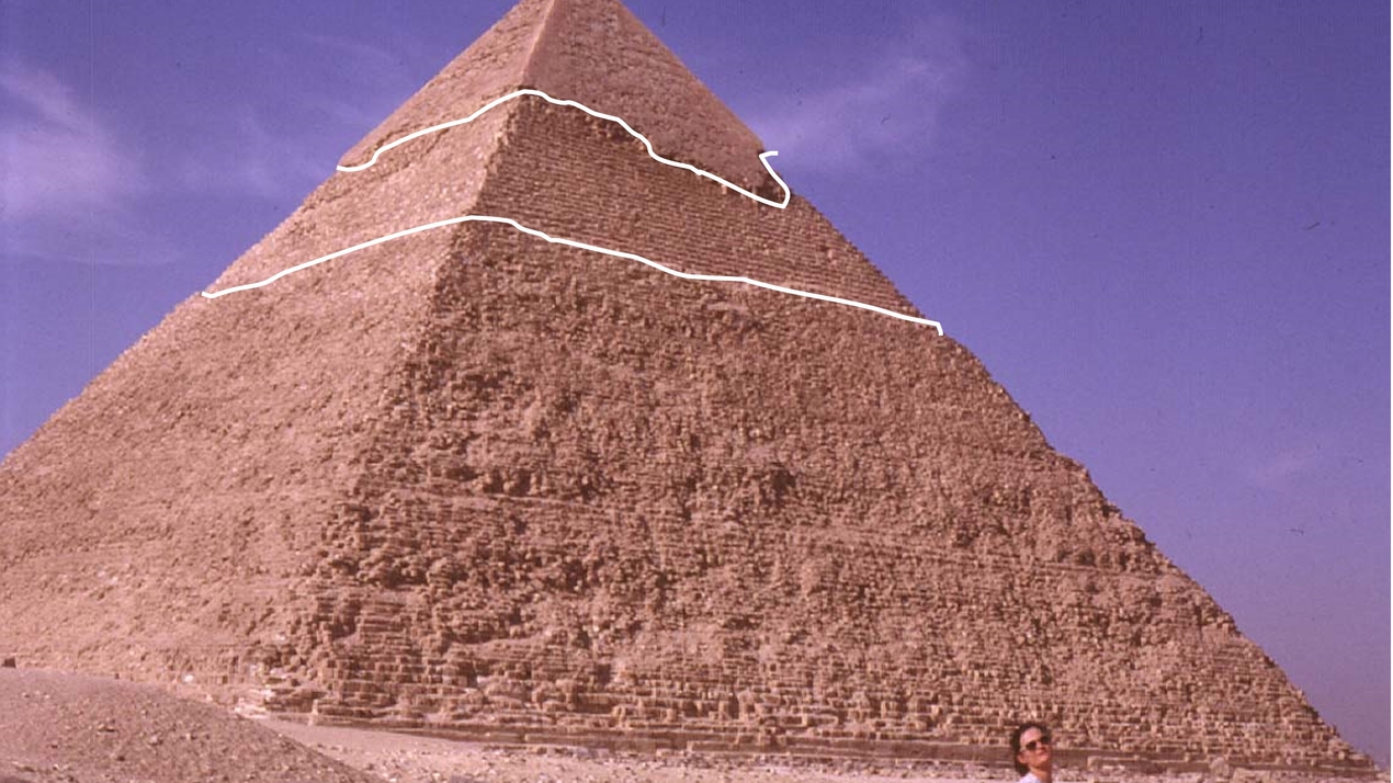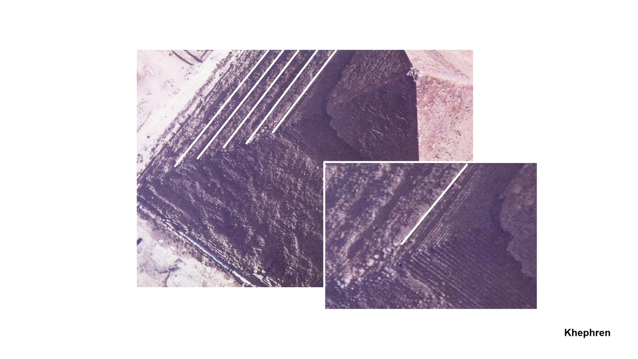 L’angle de prise de vue de cette photographie aérienne permet de mettre en évidence les 3 étages de l’érosion de la pyramide de Khéphren : a) le revêtement toujours en place au sommet, b) les assises régulières en-dessous et c) l’éboulis des cônes-enveloppes érodés : on en compte 5 dont la dernière (la plus haute) nous montre son épaisseur ; photographie qui atteste l’utilisation de la méthode « d’accroissement pyramidal » proposé (P. CROZAT – 1997)