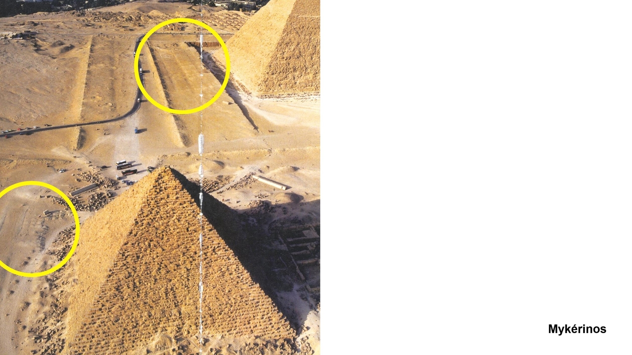 Dans le cercle jaune au premier plan, on remarquera un reliquat de carrière qui fait tout le tour de la pyramide de Mykérinos sous les débris d’érosion. Dans le second cercle, on remarquera le quadrillage des chemins de halage des blocs extraits au-dessus de la plateforme horizontale de la pyramide de Kephren.