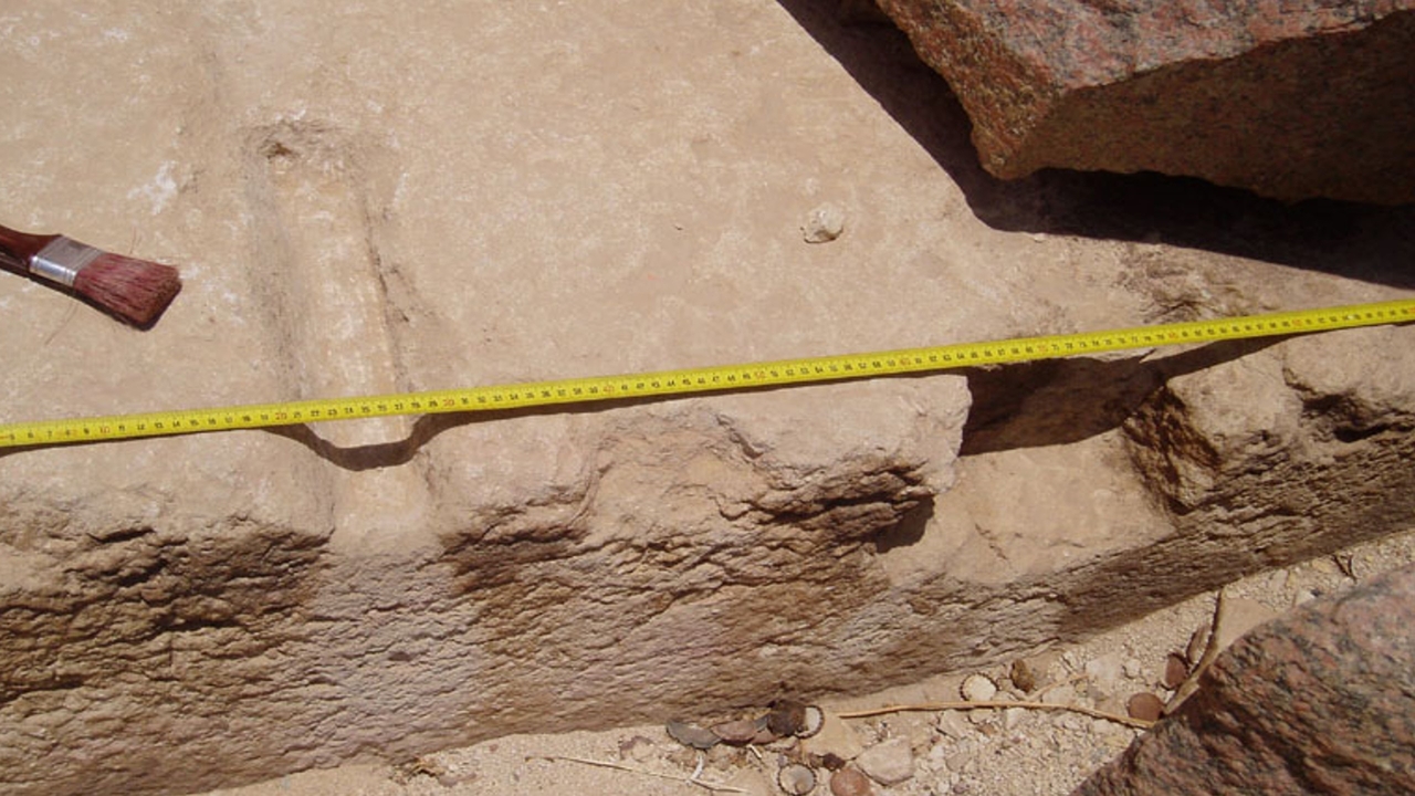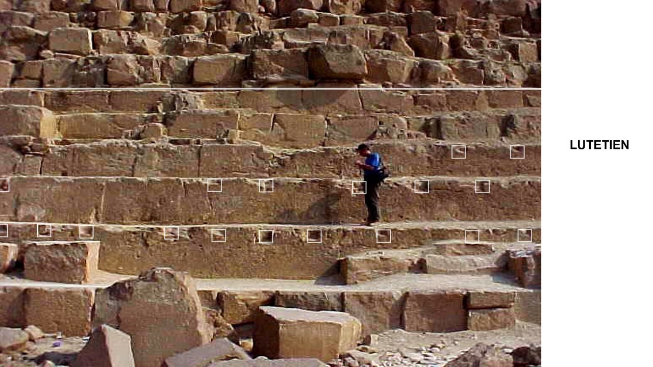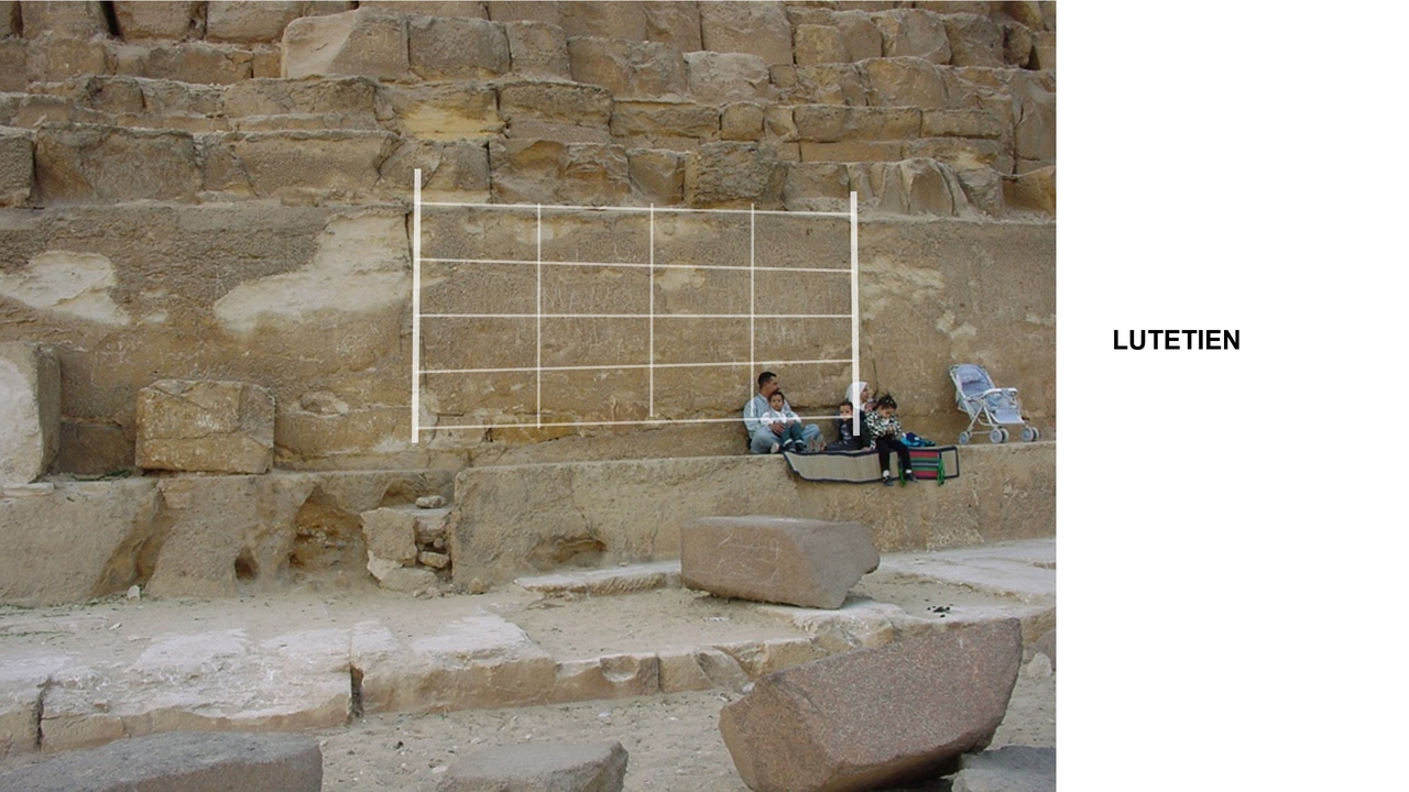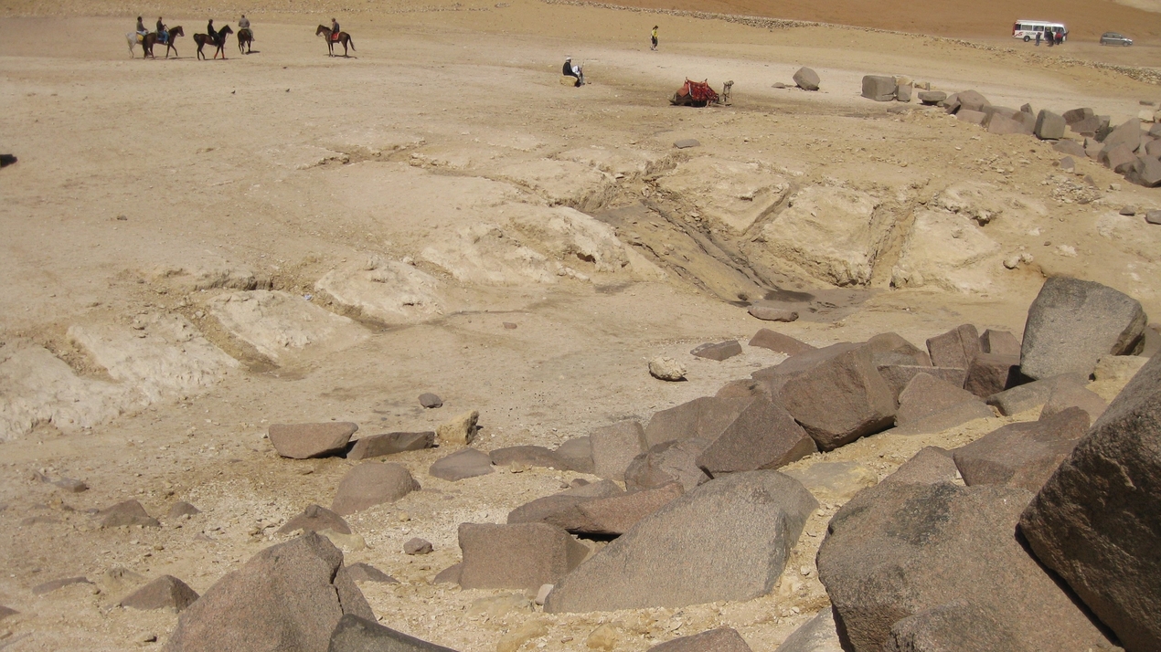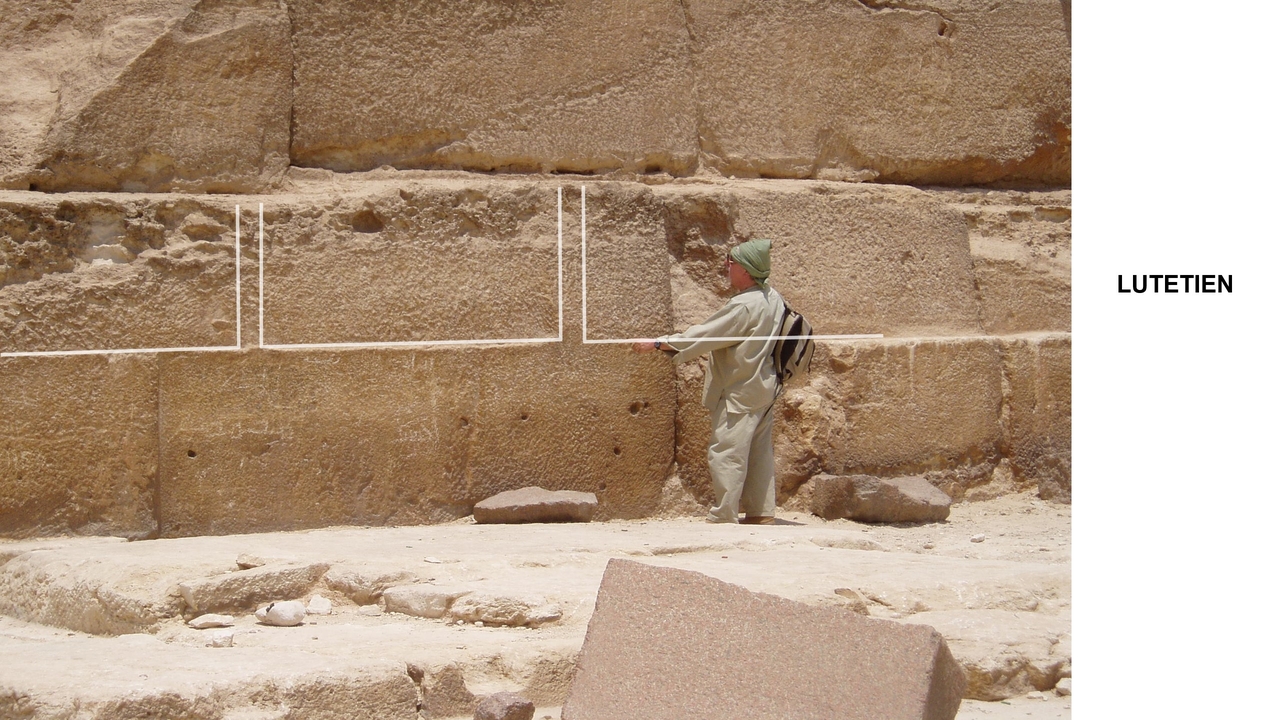 La face Nord de la pyramide de Khéphren (mais aussi tout autour) laisse voir un socle de roche-mère en place : ici un banc de la couche (g) Pierre à bâtir « Lutétien » de 2,5 m d’épaisseur dont on aperçoit le régime du réseau « diagonal » de fracturation naturelle (proportionnel à l’épaisseur des strates). Banc qu’il aura fallu redécouper en blocs « œuvrables » de la même taille que ceux qui lui sont superposés.
