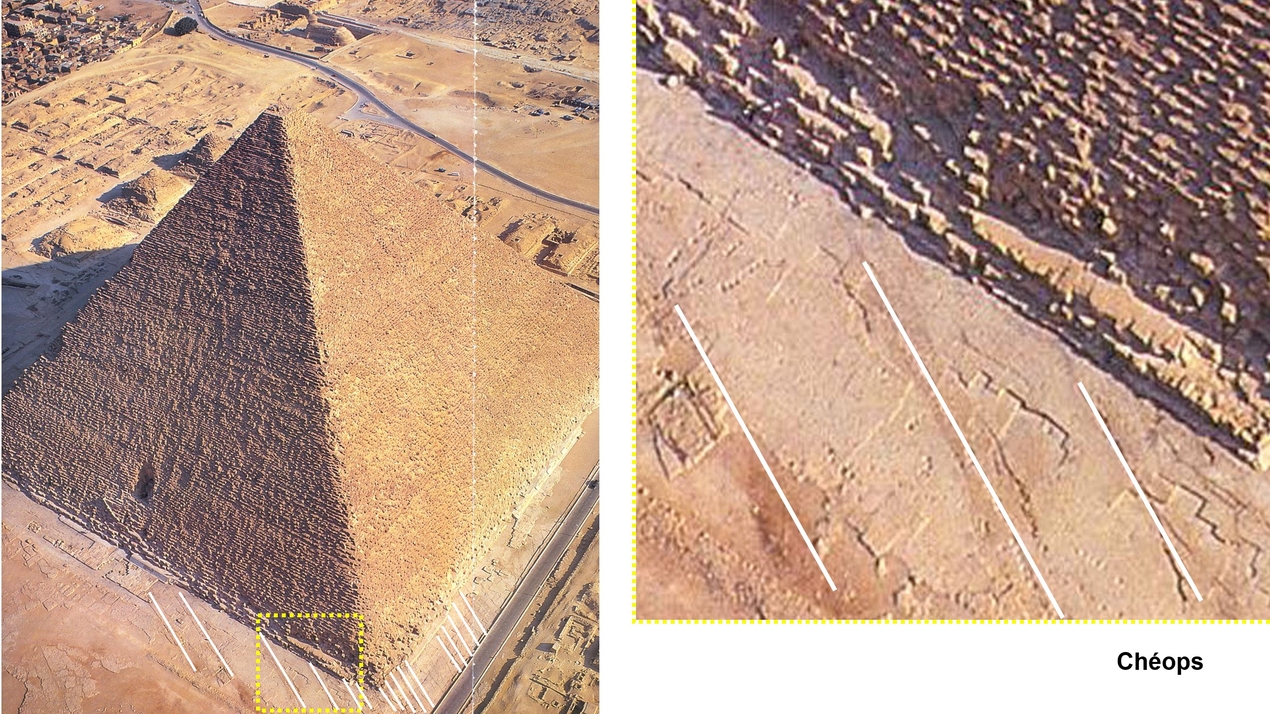 Vue aérienne de la pyramide de Khéops (angle NO) et de sa plateforme d’assiette. On remarquera les fissures (diaclases) sub-diagonales de fracturation de la roche-mère du Plateau de Gizeh ainsi que les stigmates d’extraction (qui semblent bien correspondre à la taille des blocs empilés), ainsi que le pointillé de trous alignés parallèlement au côté (appelés « boites de démisage » par les carriers, ancienne technique d’extraction).