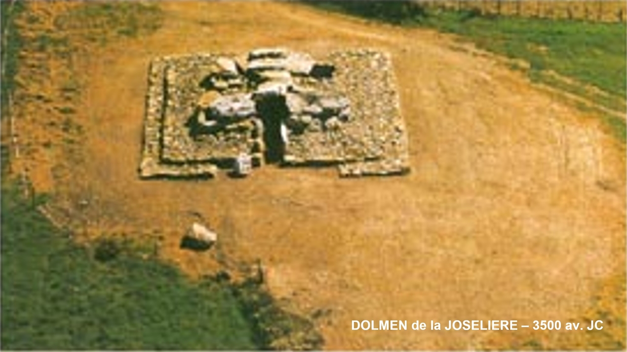 Près de Pornic, en Loire-Atlantique (France), le Dolmen de la Joselière (à 2 chambres), dépouillé en partie de son tumulus (galgal), sur base carrée, nous laisse voir 2 enveloppes. Il devait à l’origine être une petite pyramide à 2 degrés (sorte de prototype 1 000 ans avant celles d’Egypte) ; « petite », il faudrait retourner y voir de plus près...