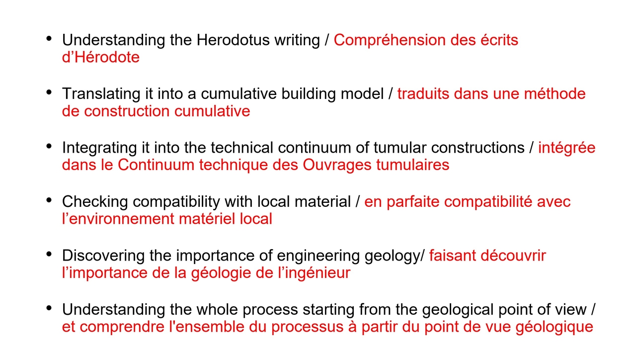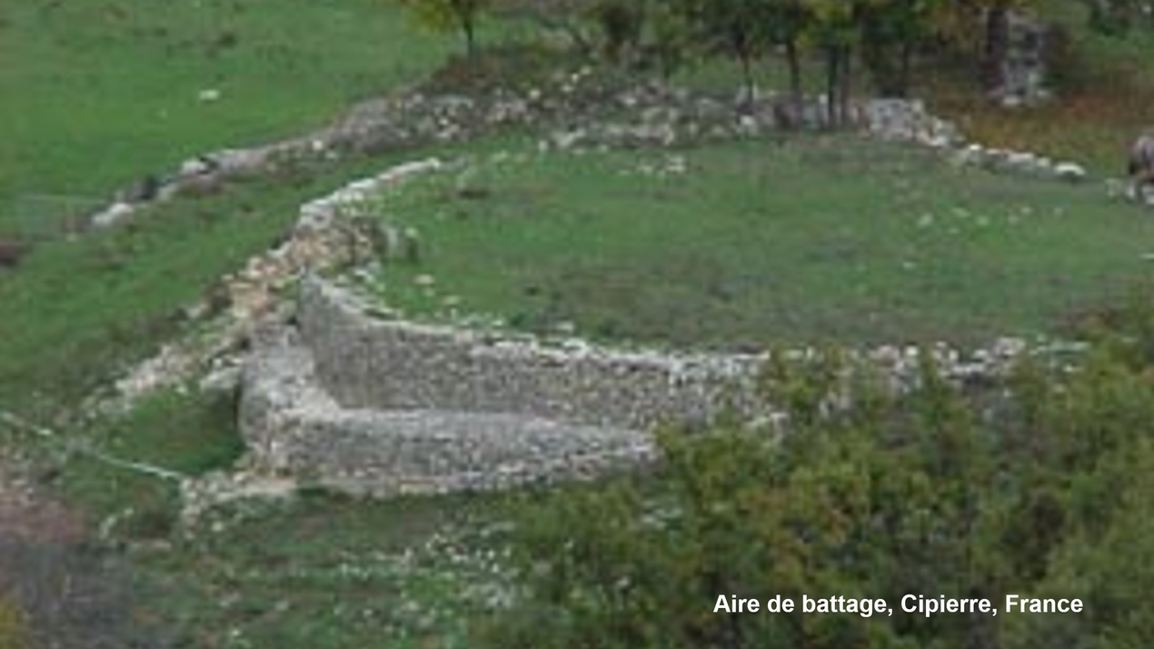 Afin de constituer la plateforme horizontale de l’Aire de battage, sur ce terrain en pente, par épierrement des terres cultivées environnantes (faire d’une pierre deux coups), il suffit de construire une série de murs semi-concentriques jusqu’à hauteur d’homme. La solution pour encore élargir cette surface est de se servir du mur suivant comme échafaudage pour exhausser le précédent, et ainsi de suite. La méthode de la construction manuelle « par degrés » (anthropométriques) empirique et vernaculaire est démontrée, ici et maintenant. Elle induira, par évolution technique des échafaudages, la méthode de construction des pyramides à degrés d’Egypte que l’on devrait appeler « pyramides par degrés » pour bien faire comprendre aux enfants que « la méthode constructive induit la forme ».