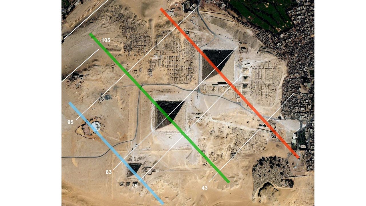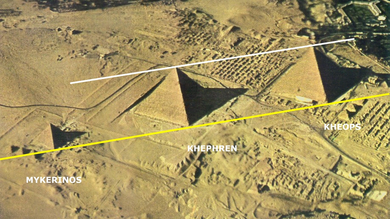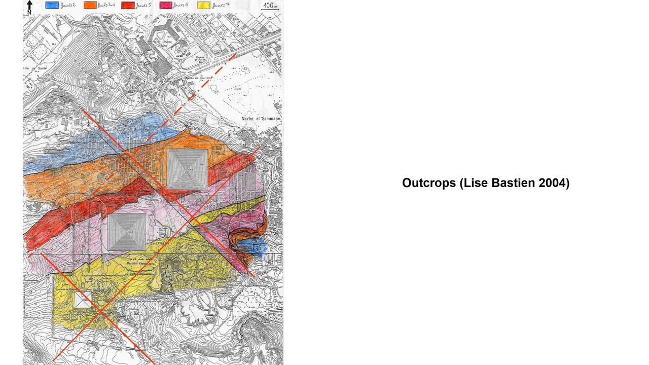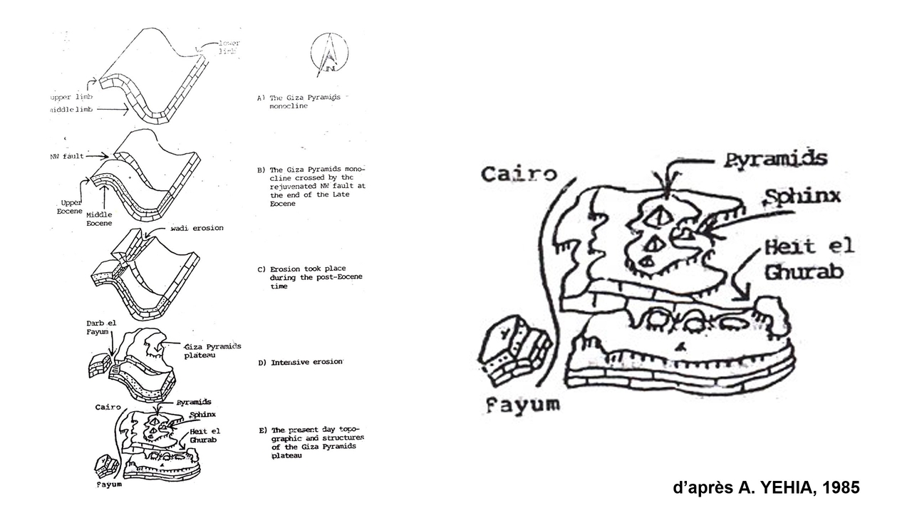 Les 3 grandes pyramides du Plateau de Gizeh sont implantées sur le flanc haut du pli anticlinal, elles ne sont pas alignées par leurs sommets mais par leurs angles SE.