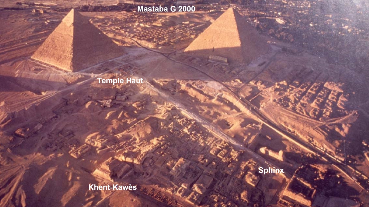 Cette vue partielle du versant SE du Plateau est très difficile à comprendre, en partie recouverte de tombes. Néanmoins on reconnaît la pyramide de Kephren au revêtement lisse de son sommet, à gauche sur sa plateforme son Temple Haut, son Allée Montante depuis son Temple Bas ainsi que le Sphinx en bas ; la pyramide de Khéops – la plus grande - dont la pointe a été démontée ; entre ces 2 pyramides, tout en haut, le gros Mastaba G 2000 ; et en bas la pyramide (mastaba à 2 niveaux) de la Reine Khent-Kawés.