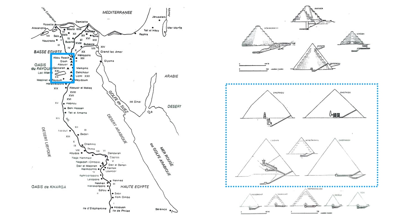 - à gauche, dans l’encadré, les pyramides à degrés de la III° dynastie et les 5 Grandes Pyramides de la IV° dynastie, situées sur la rive occidentale du Nil ; le plateau des pyramides s’étend sur 60 km,