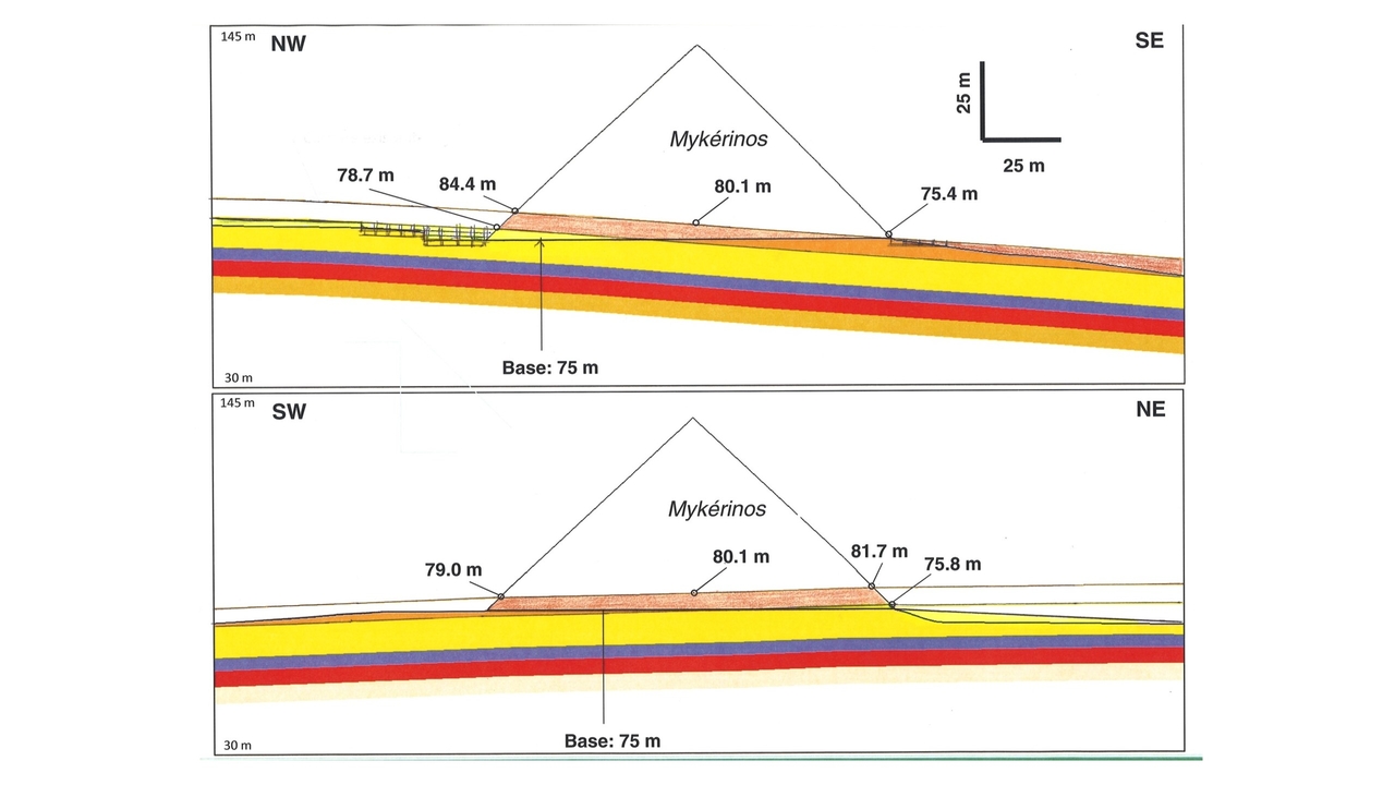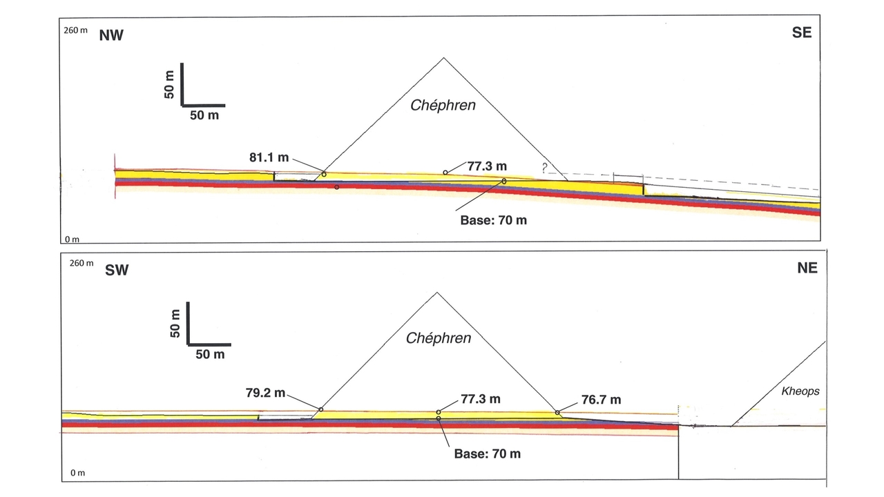 Coupes sur les diagonales de la Pyramide de Mykérinos où l’on remarquera que cette pyramide est essentiellement composée de matériaux extraits de la couche (a) Auversien sur un carreau à 75 m.