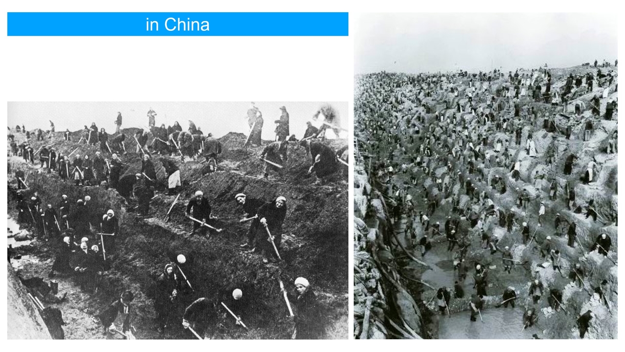 Travaux – ici, creusement d’un canal par des « intellectuels » à rééduquer, en Chine, durant la Révolution Culturelle- nécessitant une méthode, une organisation, une discipline et une main-d’œuvre nombreuse, relevant de la « logistique algorithmique ».