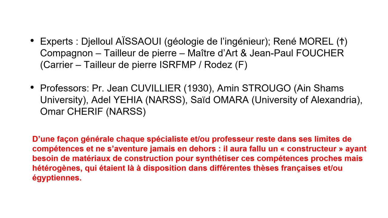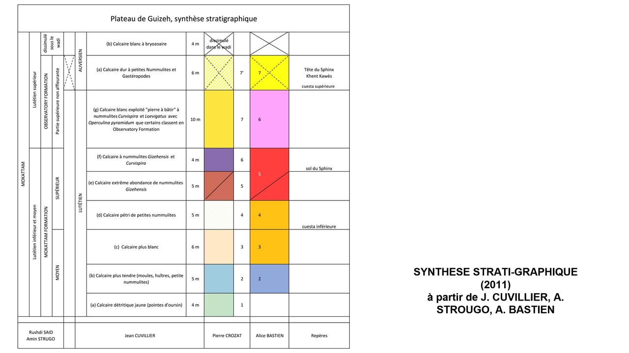 Stratigraphie du Plateau de Gizeh établie par Jean CUVILLIER, Thèse d’Etat, Laboratoire de Géologie appliquée, Université P & M. Curie, Paris VI - Prof. de Géologie au Caire (en 1930) « Contribution à l’étude géologique du Mokattam (1923-24) » et « Révision du Nummulitique égyptien (1930) ».