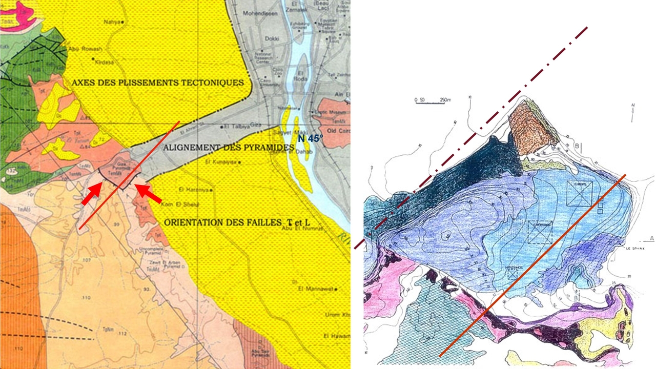 Carte géologique du Caire et des environs : le plateau de Gizeh est bordé par 2 failles (indiquées par les 2 flèches en rouge) qui indiquent un pli anticlinal dont l’axe est orienté Nord 45° (en rouge). Sur le plan à droite on remarquera que les 3 grandes pyramides de Gizeh sont implantées parallèlement à cet axe (alignées par leurs angles SE) sur un gisement spécifique et qu’elles sont toutes trois orientées diagonalement par rapport à cet axe.