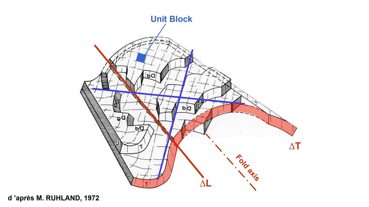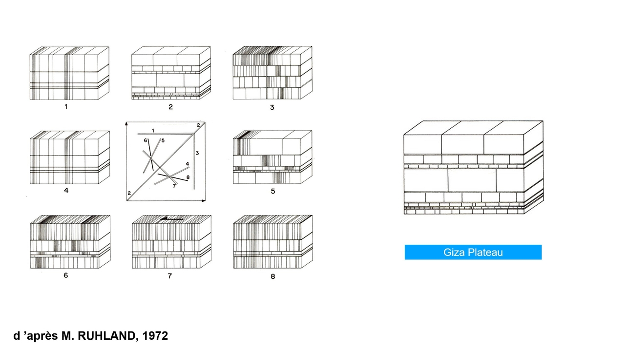 La théorie développée par M. RULAND « Recherches sur la fracturation naturelle des roches associée à divers modèles structuraux 1969-1972 » Institut de géologie de l’Université Louis Pasteur, Strasbourg (France) – Équipe de Recherche Associée au C.N.R.S. « Géologie structurale et analyse tectonique ». L’image présentée ici a été inversée pour servir de support adapté à l’image suivante sur le Plateau de Gizeh.