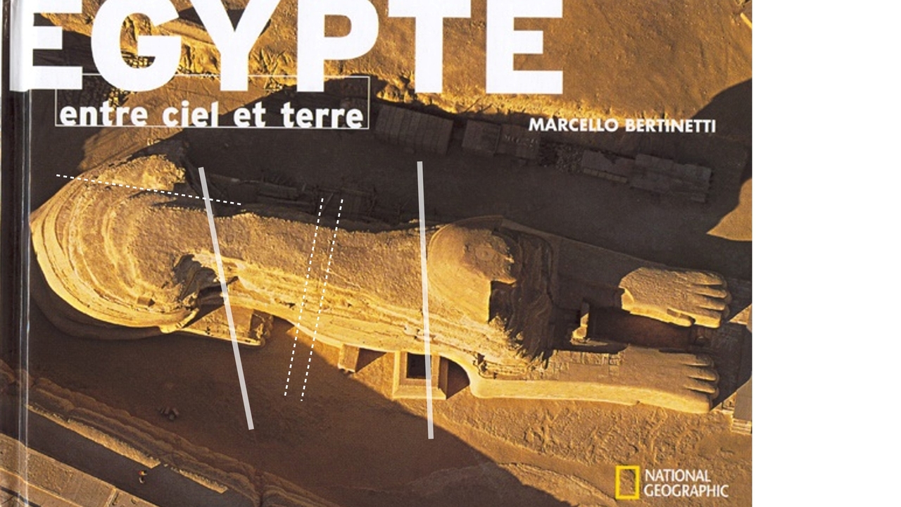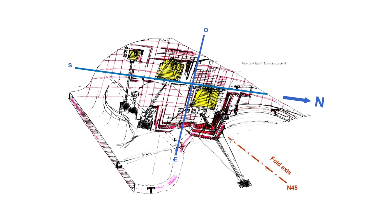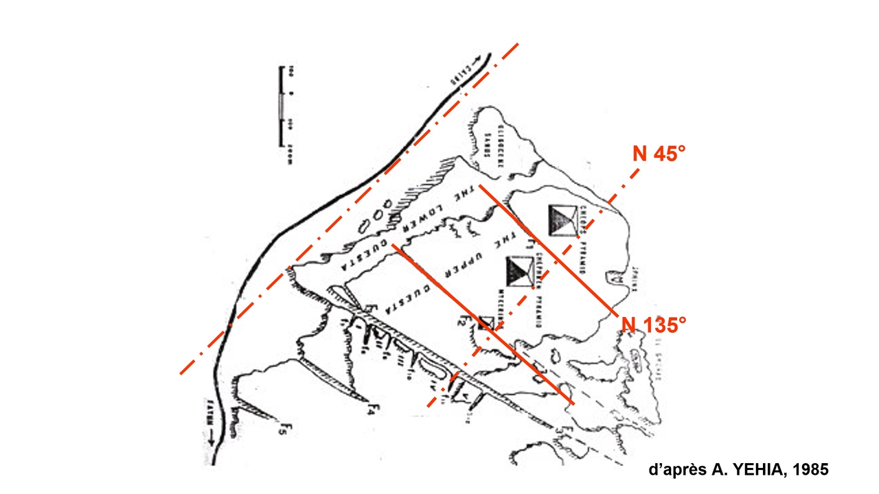 - l’implantation des 3 pyramides du Plateau de Gizeh alignées (par leurs angles SE) parallèlement à l’axe du pli (en Nord 45°) selon les diaclases longitudinales - Δ-L