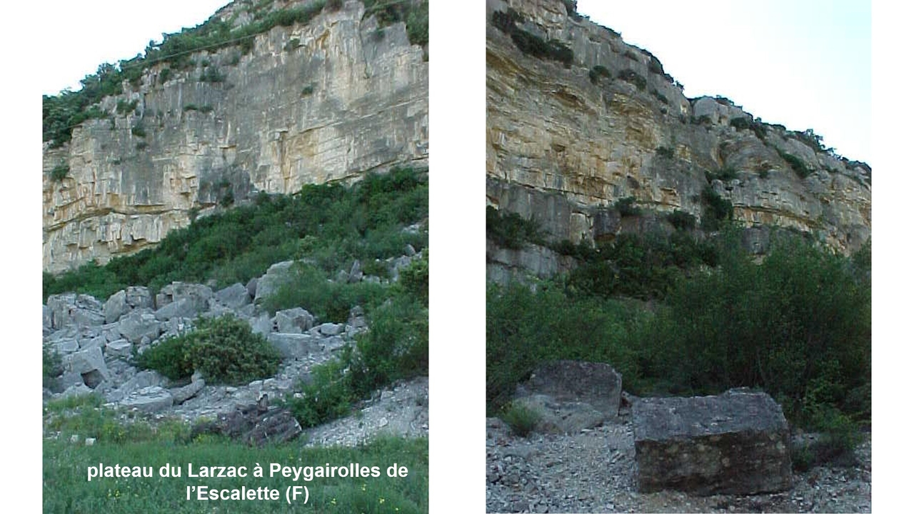 Exemple probant de l’existence des réseaux de fracturation naturelle des roches, fournissant des blocs naturellement équarris, tombés de cette falaise calcaire.