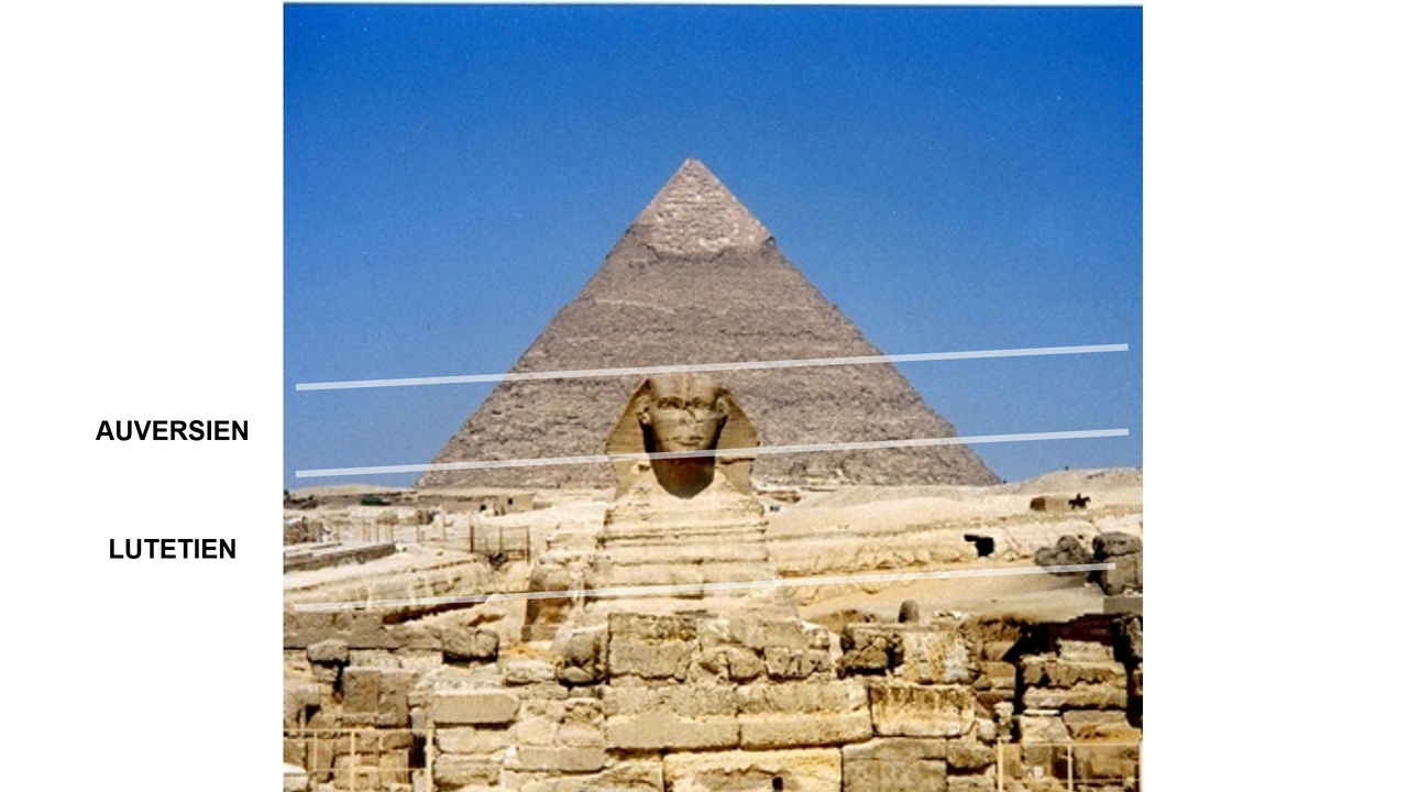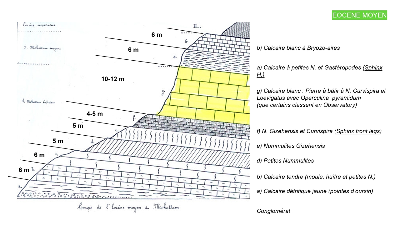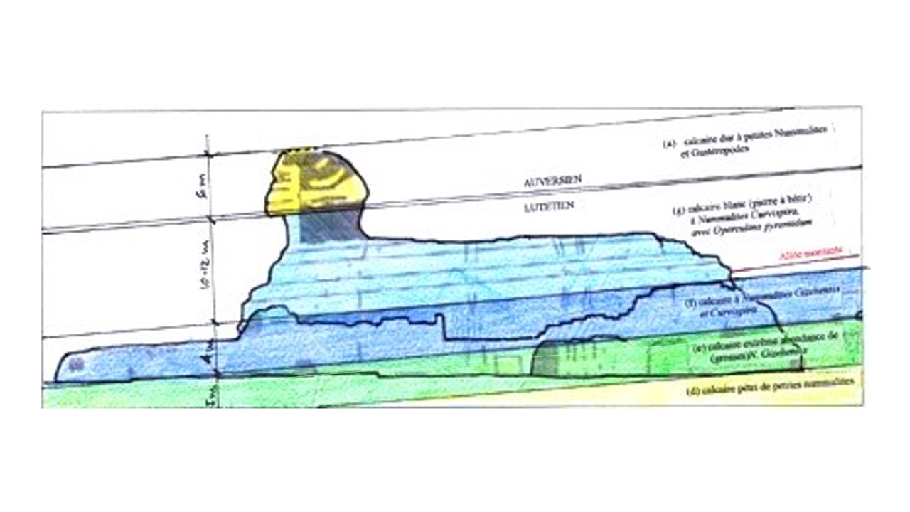 Le Sphinx : sa tête appartient à la couche (a) de l’Auversien 6 m, le cou et le haut du corps à la couche (g) pierre à bâtir 10-12 m du Lutétien. Les pattes avant et la partie basse du corps appartiennent à la couche (f) calcaire à Nummulites Gizehensis & Curvispira 4 m, les pattes arrière et la queue à la couche (e) calcaire à Nummulites Gizehensis en extrême abondance 5 m.