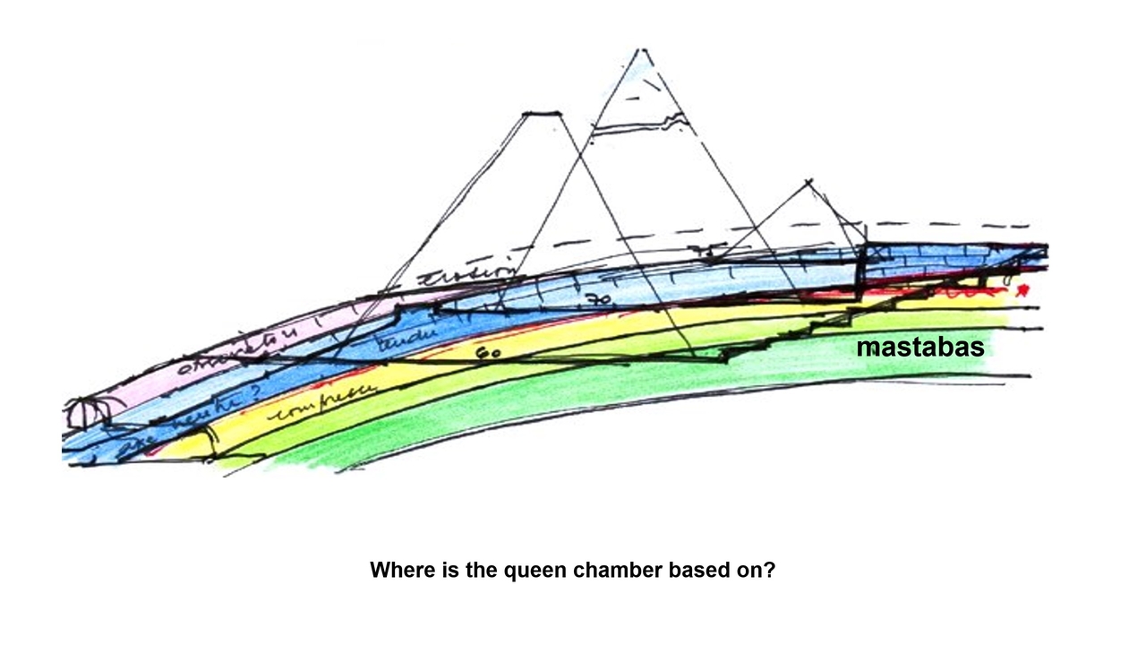 À remarquer que la rampe, permettant la mise en place de l’arc de décharge au plus haut des rehausses, correspond exactement au pied Nord de la pyramide. La surface colorée bleue devrait (ce qui reste à démontrer) correspondre à la partie de « roche-mère » du plateau non exploitable, les côtés de ce triangle isocèle étant les lignes d’exploitation des carrières subhorizontales au pourtour même de chaque cône-enveloppe de l’accroissement pyramidal ; ce qui présuppose que la chambre de la Reine serait posée sur le Plateau d’origine (pré-existant).