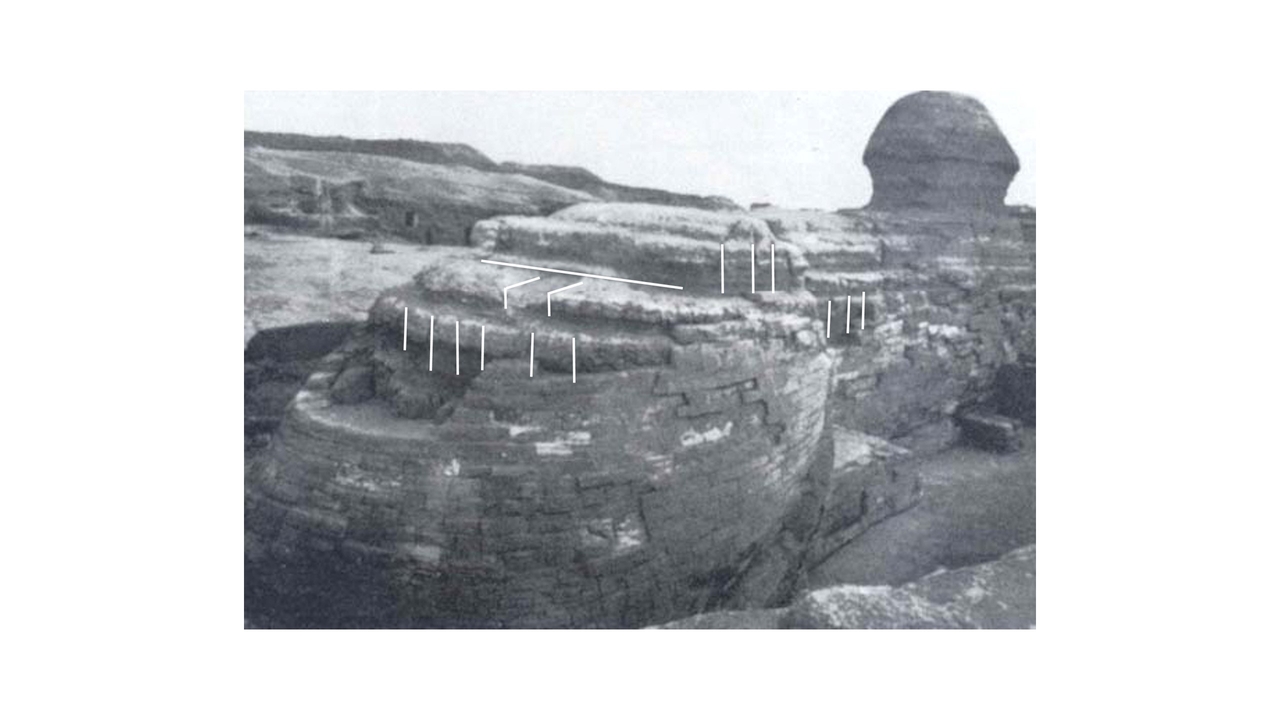 Vue de la croupe du Sphinx (avant réfection) où la roche-mère de la couche (g) pierre à bâtir est bien repérable (érodée car tendre) ; on remarquera le réseau de fracturation naturelle des roches – réseau diagonal droit et gauche - des différentes strates ainsi que la taille des blocs unitaires. L’analyse de ces réseaux sur le Sphinx n’avait jamais été faite, elle explique de façon rationnelle pourquoi le Sphinx est orienté EO, non pas par la course du soleil mais par la GÉOLOGIE.