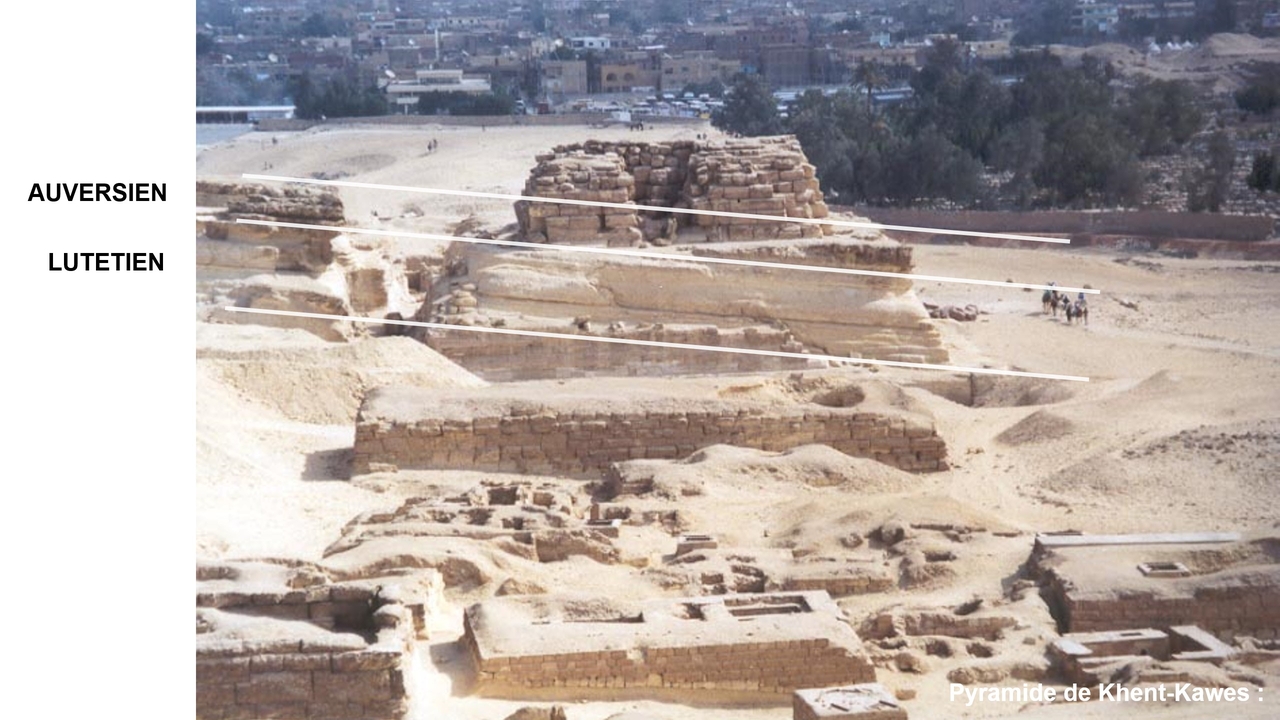 Pyramide de Khent-Kawés : à gauche la couche (a) Auversien en place ainsi qu’à droite. Le 2ème étage est constitué de blocs « unitaires » (non fissurés) empilés fournis par cette couche.