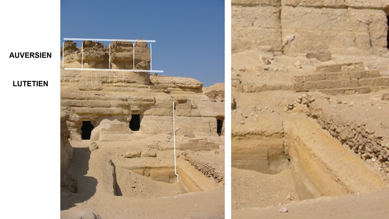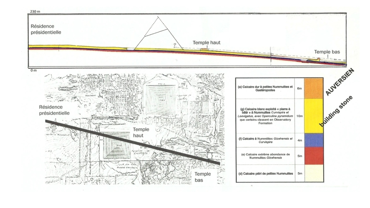 Coupe stratigraphique sur l’Allée montante de la pyramide de Khéphren : la Tête du Sphinx et le Temple Haut appartiennent à la couche (a) Auversien 6 m, le corps du Sphinx et le Temple Bas à la couche (g) pierre à bâtir 10-12 m.
