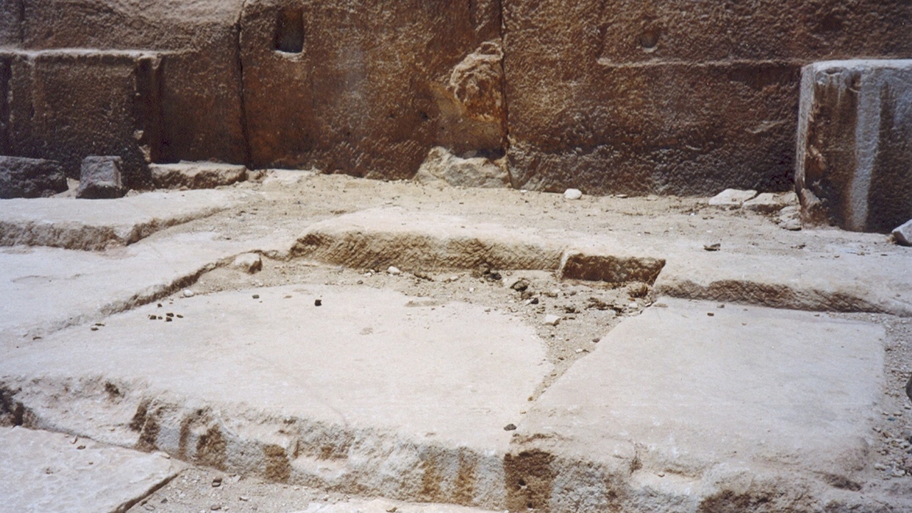 À l’angle Ouest-Nord de Khéphren, au sol, on retrouve ces mêmes encoches carrées (et le même écartement), stigmates des « boite de démisage » (pour décoller le bloc de sa roche-mère).