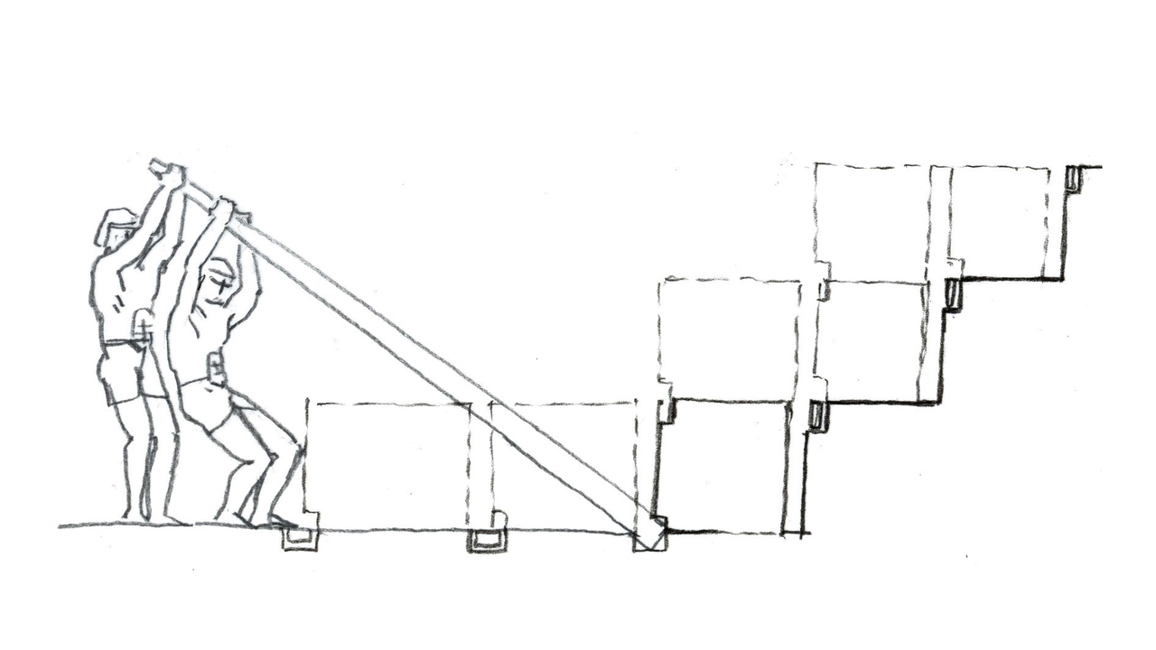 Le croquis du bas nous montre 10 blocs de carrière et la méthode « latérale » d’empilage (ne pas oublier de décaler d’un tiers le « crossaï » en profondeur, ce qui donne l’angle des faces de la pyramide) et laisse un appui pour la « machine » de bois d’Hérodote dont le mouvement-machine devra répondre à cette manœuvre, un levier sur un trépied devrait suffire.