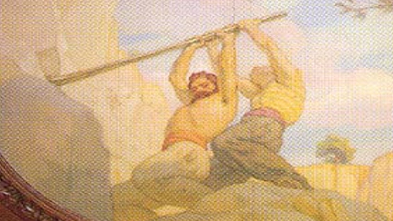 Exemple : fresque datant du XX° siècle, au plafond de la Chambre des Métiers de Commercy (France) montrant 2 hommes munis d’une « pince à talon en fer » (le même type d’outil : bras de levier, mais plus performant) en plein effort de « démisage » d’un bloc dans une carrière locale.