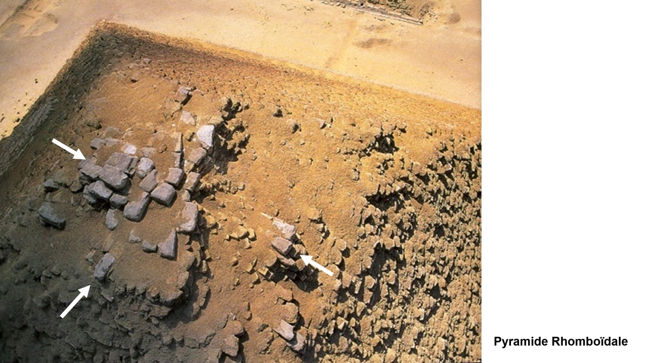 Photographie aérienne du sommet de la Pyramide « rhomboïdale » à Dashour-Sud (cliché de Marcello Bertinetti « EGYPTE entre ciel et terre » éditeur National Geographic - 2004) : le modèle de l’Auteur (P. Crozat – 1997) propose une disposition des blocs « en boutisse » (frontale par rapport à la face considérée) : ce que les flèches indicatives semblent confirmer ici.