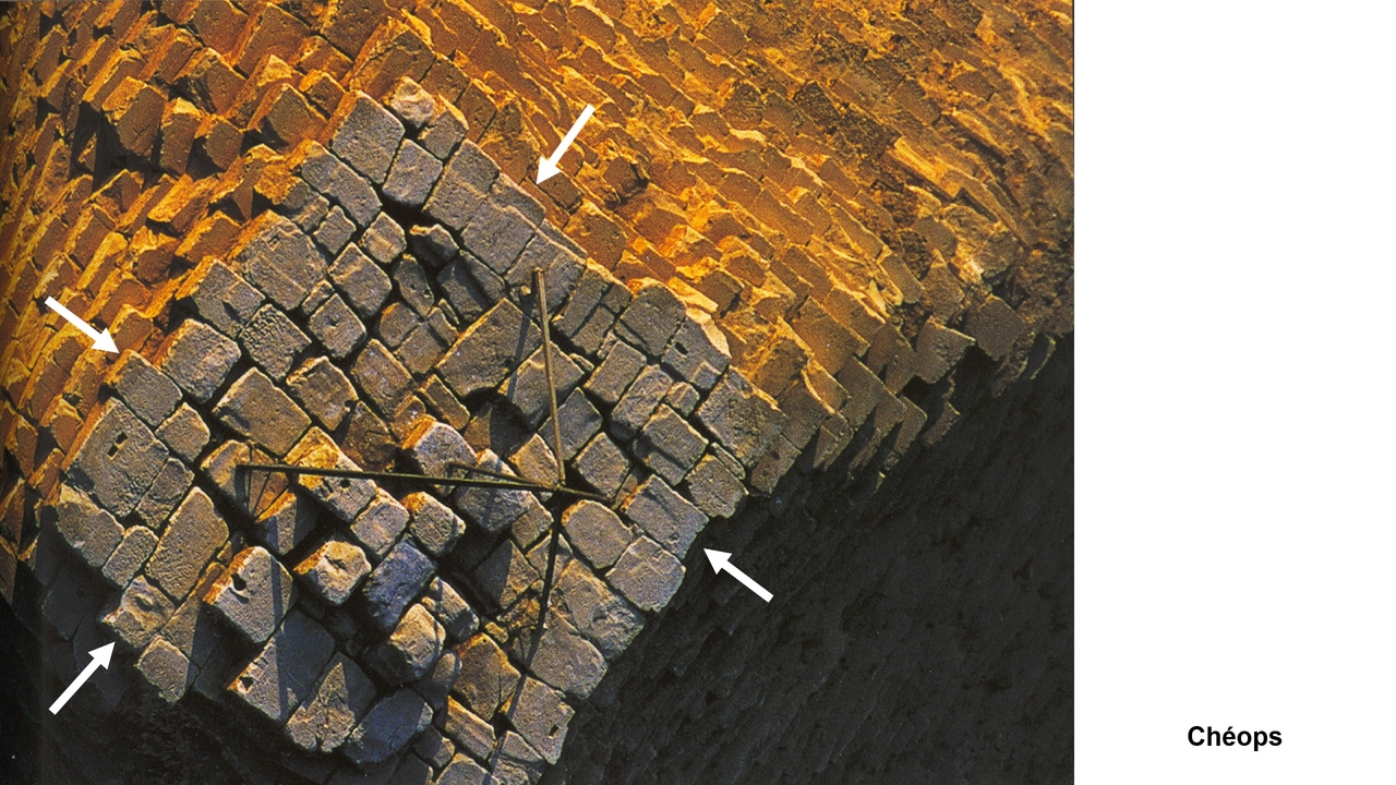 Vue partielle (face Sud) de la plateforme sommitale actuelle de Khéops où l’on remarquera les entailles des blocs (d’appui à venir - bomides) pour recevoir les futurs blocs (crossaï), c’est bien là la preuve de l’utilisation de « l’appareillage horizontal à décrochement » observé par A. CHOISY dans son « Histoire de l’Architecture ».