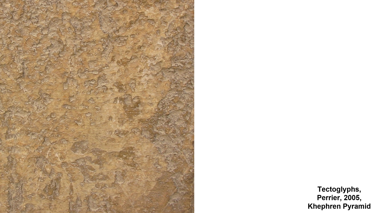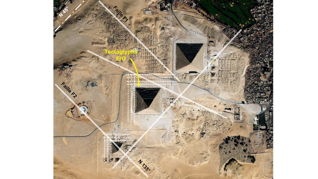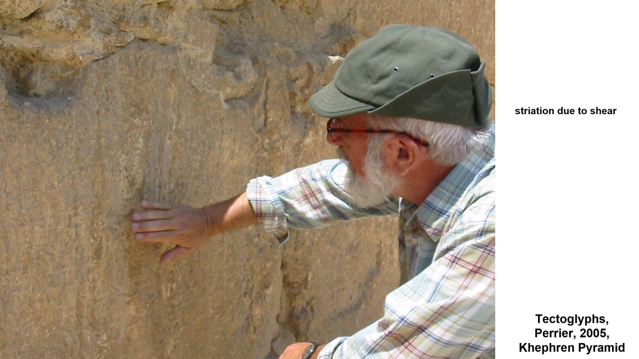 La preuve scientifique définitive de la présence du réseau secondaire « diagonal » de fracturation naturelle a été apportée par la découverte (R. Perrier & P. Crozat – 2005) des stries caractéristiques (du calcin qu’il caresse) d’un mouvement de cisaillement Est – Ouest, sur le socle de roche-mère au pied de la Pyramide de Khéphren, sur sa face Nord, proche de son angle NO.