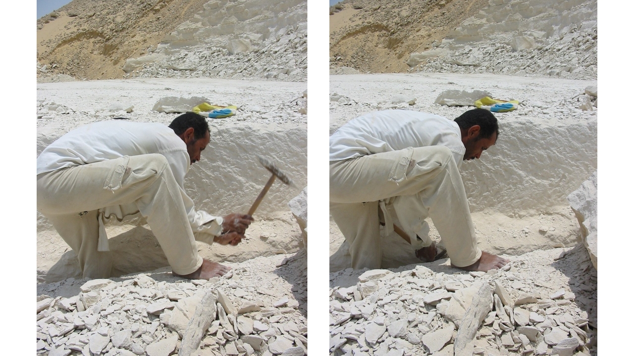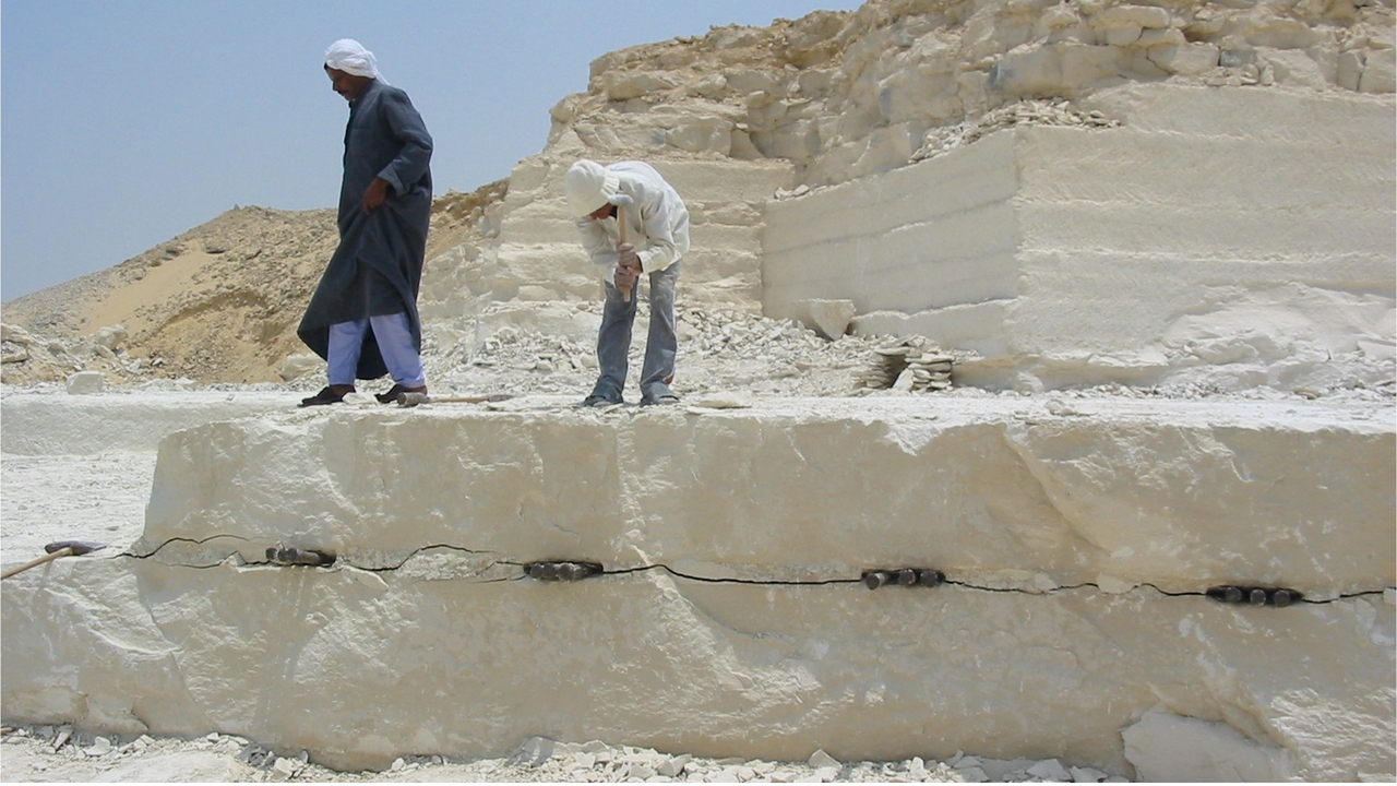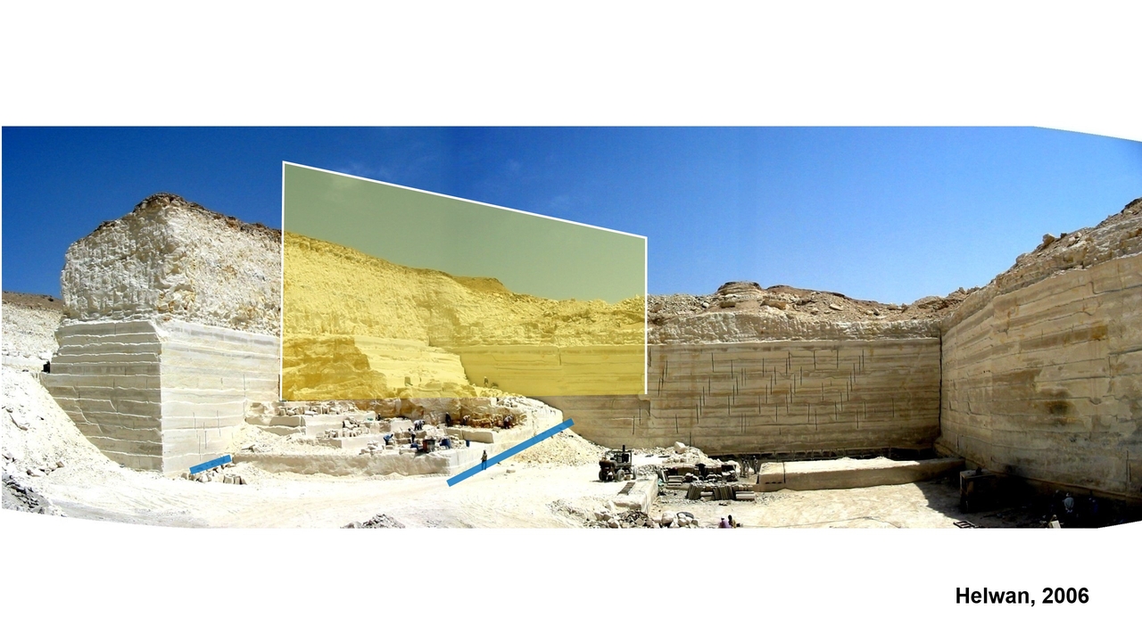 Cette carrière d’extraction manuelle (dite des 2 frères) exploitée encore aujourd’hui à Helwan, dans la couche « Observatory », nous montre une manière ancestrale d’exploitation (hormis les coins de fer qui remplacent les entailles d’amorce de rupture d’autrefois) : ici le dédoublement d’un banc.