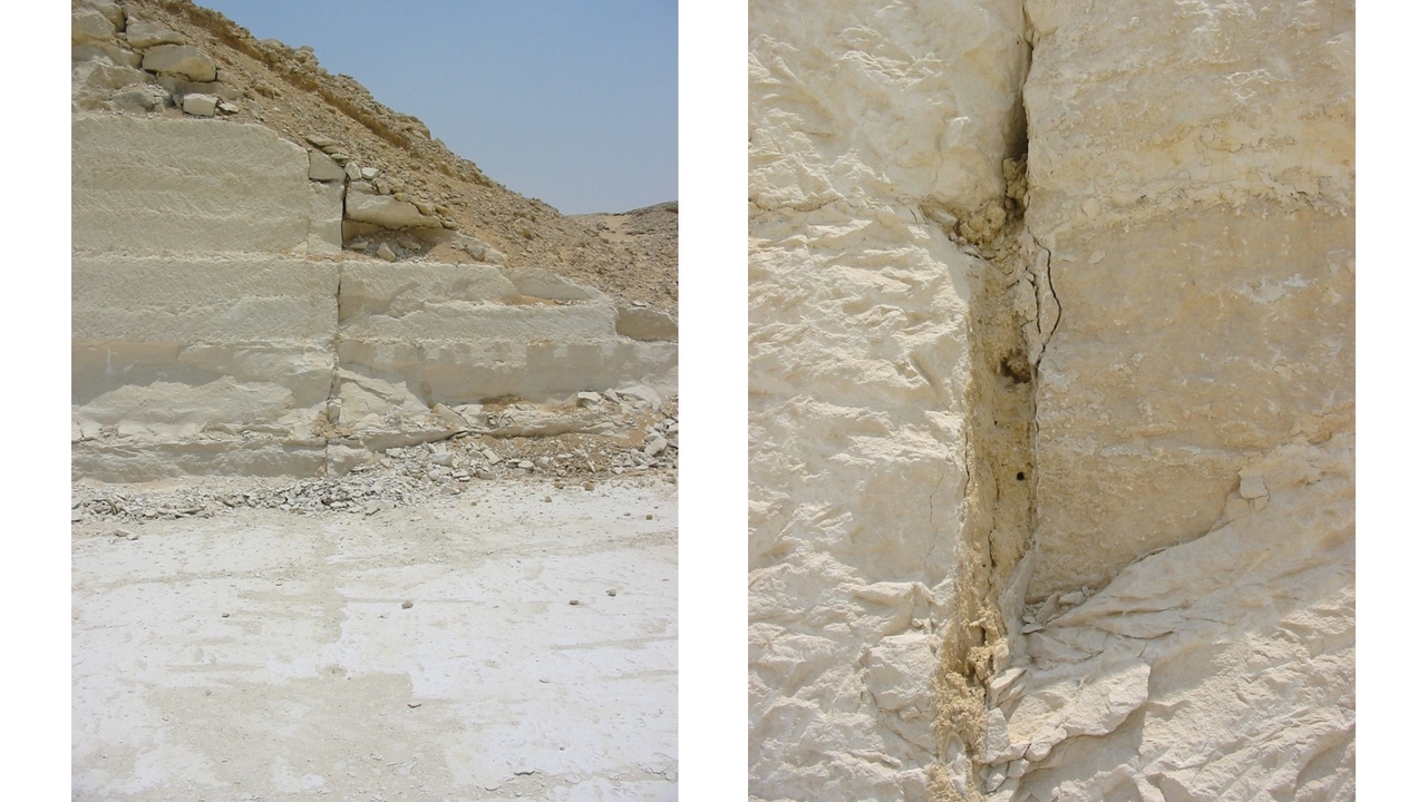 Sur la face Ouest de la pyramide de Khéphren, les 6 premières assises ont été taillées dans la couche (g) pierre à bâtir « Lutétien » laissant apparaître des encoches soigneusement rebouchées par des diaphragmes de même provenance et régulièrement disposés qui semblent résulter du mode d’extraction « par démisage » (technique de décollement d’un bloc à l’aide d’un levier enchâssé dans une « boite de démisage » creusée au pied).