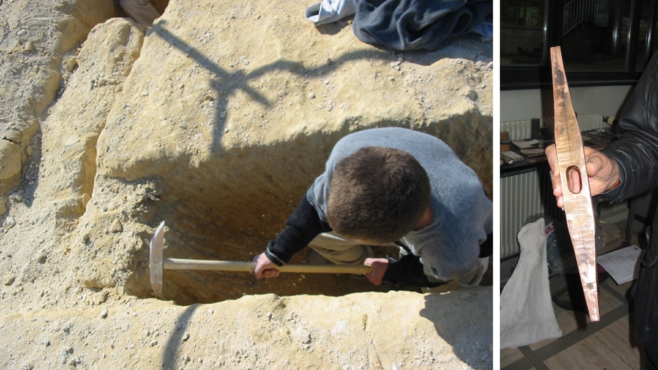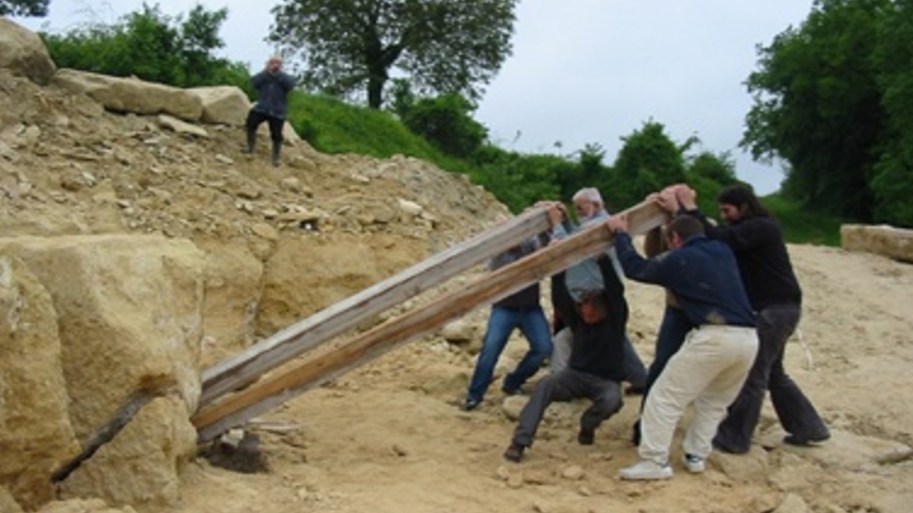 Essais d’extraction d’un massif de calcaire « Lutétien » à Bonneuil, France (Carrière Mascitti) avec les Compagnons du Devoir et un pic de bronze (trop lourd) fabriqué par la fonderie des Ateliers Saint-Jacques du Domaine de Coubertin à Saint-Rémy-lès-Chevreuse, France en 2008 (sous la direction du Compagnon René Morel).