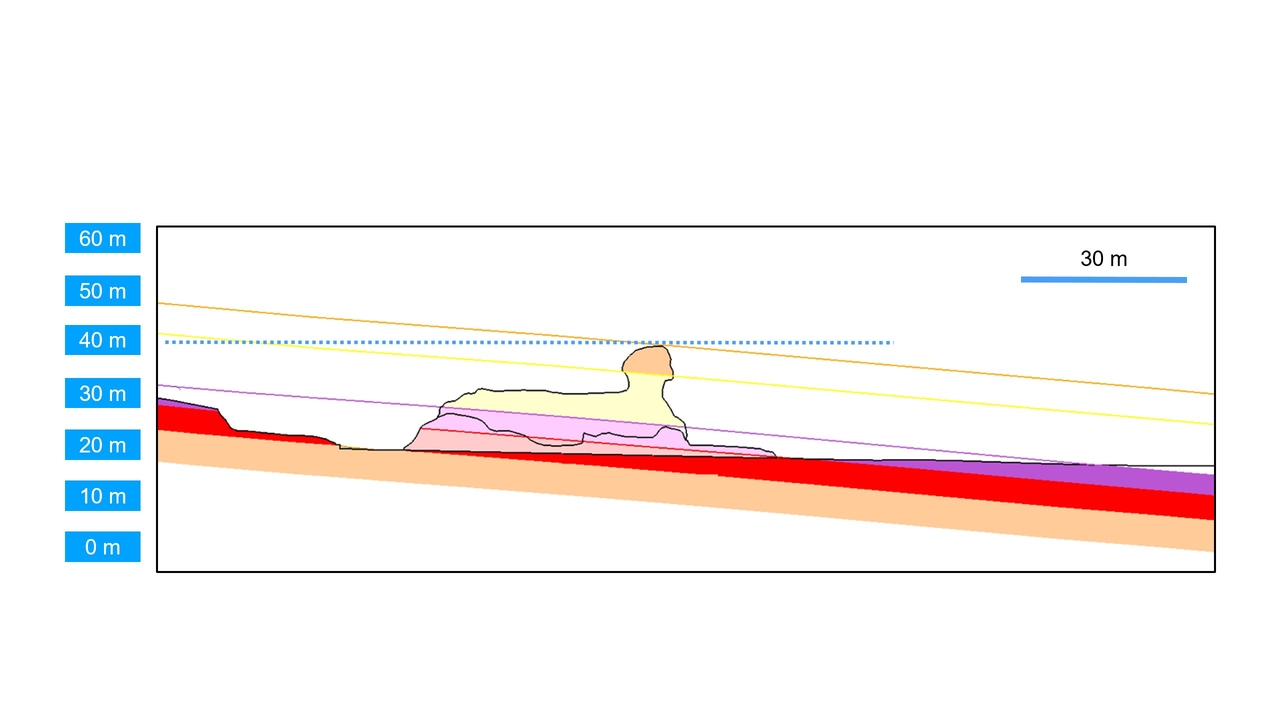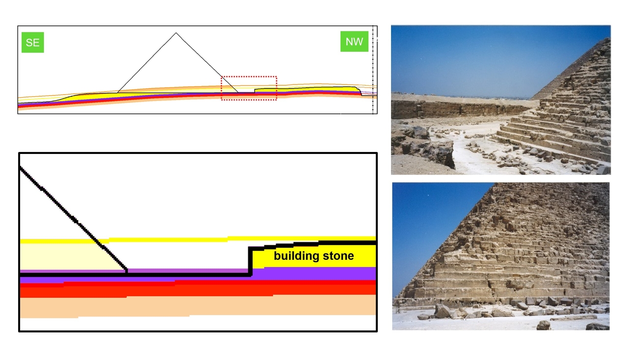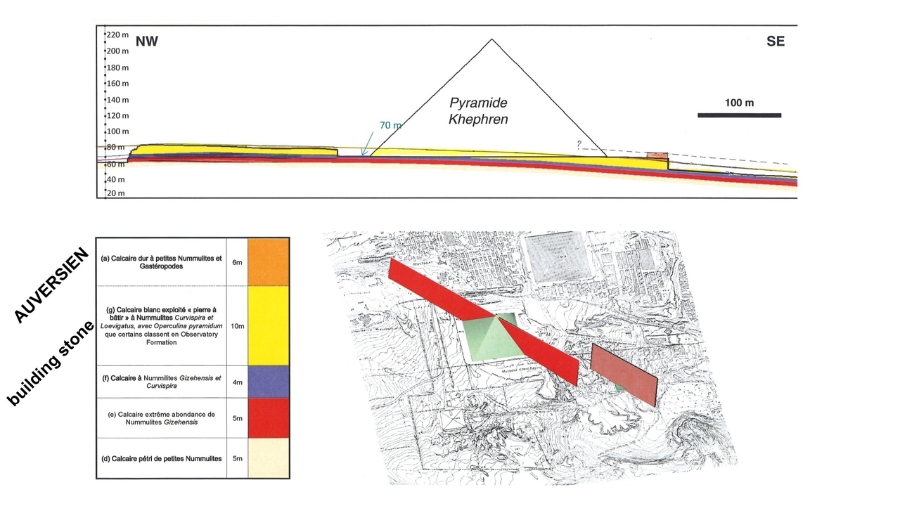 La pyramide n’emprunte ses matériaux qu’à l’unique couche (g) pierre à bâtir (facile à œuvrer, compacte, mais « délitable »), qui se situe au SE en-dessous et au NE au-dessus (sans toucher à la Couche (f) sous-jacente) justifiant un emprunt complémentaire à la Couche (g) au-dessus du front de carrière Ouest.