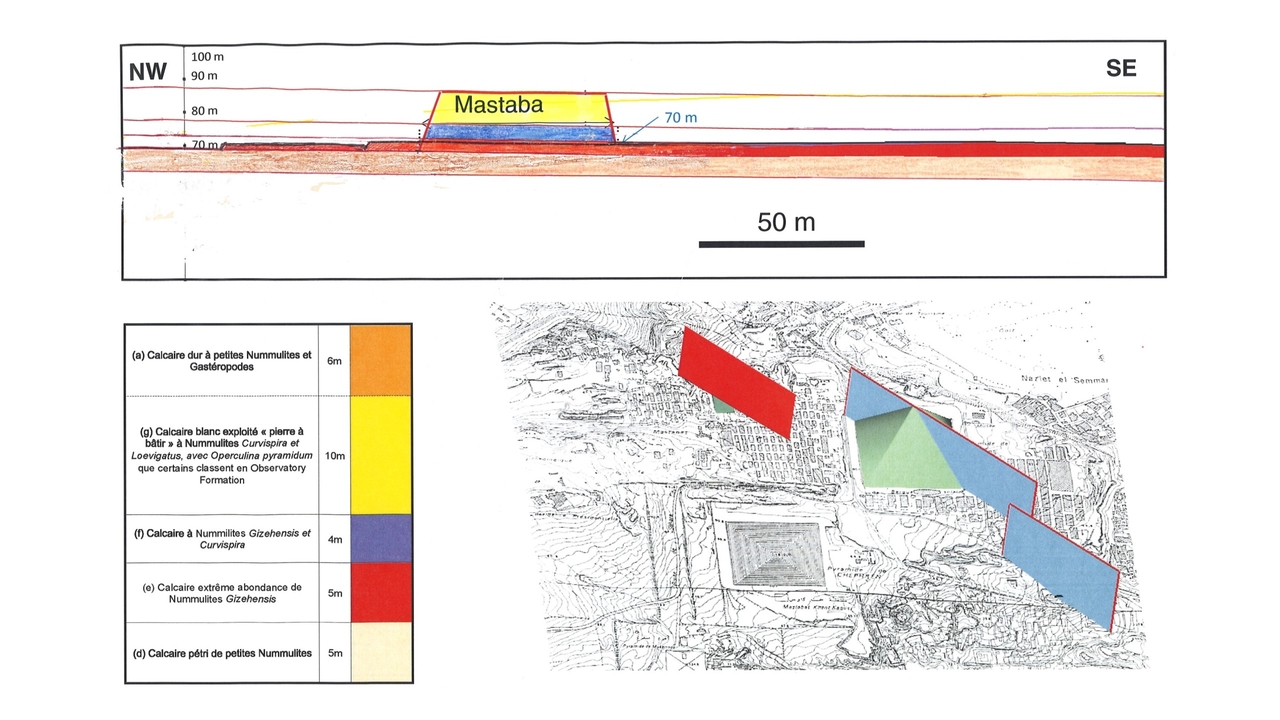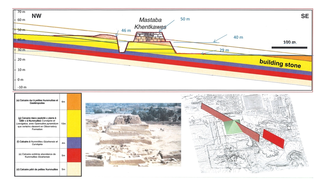 La Pyramide de Khent-Kawès est faite des matériaux tirés de la couche (a) Auversien, sur un socle de roche-mère de la couche (g) pierre à bâtir