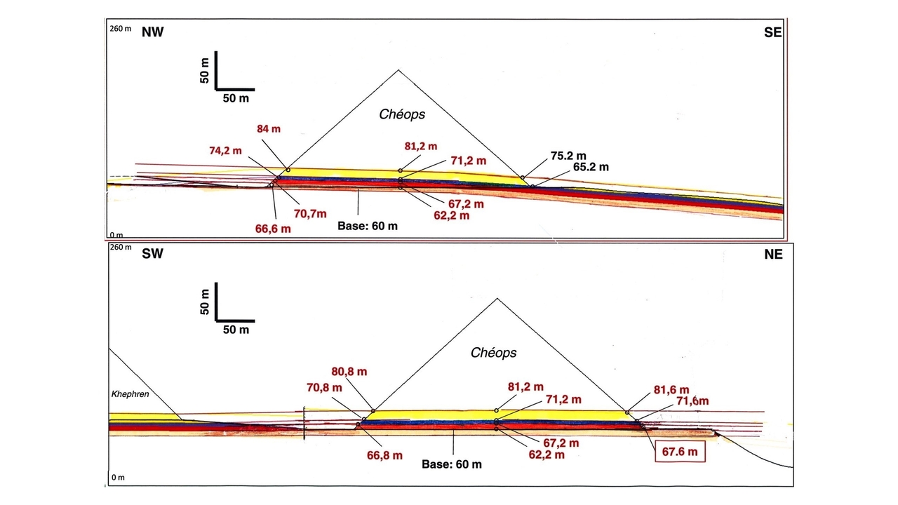 Plateau de Gizeh, indication des niveaux topographiques et des coupes diagonales NO/SE des 3 pyramides, préparatoires à l’établissement de la simulation de la « paléo-topo-stratigraphie » du plateau.