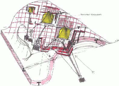 - la carte géologique du Caire et des environs indique l'orientation NE-SW du plissement tectonique et des failles de bordure du plateau de Gizeh, il en résulte que les pyramides de Gizeh sont donc disposées et orientées en fonction de la géologie et de la fracturation naturelle des roches :