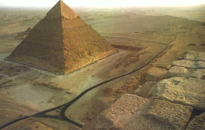 - la vérification de la concordance de la pierre du plateau de Gizeh (calcaire lutétien – éocène moyen – à nummulites) et des trois grandes pyramides et le repérage par vue aérienne des zones d'emprunt sont aisés,