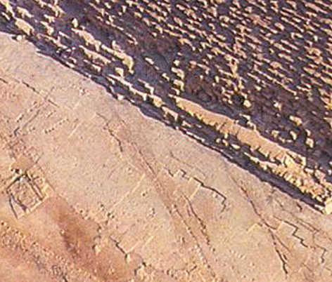 Le défoncé observable alentour[20]Note [20] – Voir la photographie aérienne réalisée par Marilyn BRIDGES et publiée dans son ouvrage « L'Égypte vue du ciel » p 40 (1996) – Éditions du Seuil. ne serait-il pas en fait (hypothèse à vérifier) le reliquat de la zone d'emprunt – la carrière – des matériaux avec lesquels elle est construite ?